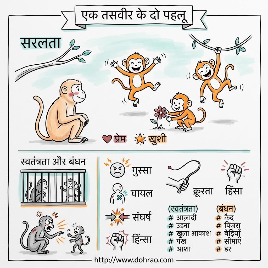 - स्वतंत्रता बनाम परतंत्रता: लेखक इस निष्कर्ष पर पहुँचे कि ये एक ही जीव के दो बिल्कुल अलग पहलू हैं। स्वतंत्रता प्राणी में दया, करुणा और प्रेम भरती है, जबकि परतंत्रता (कैद) उसे क्रूर, हृदयहीन और आक्रामक बना देती है।