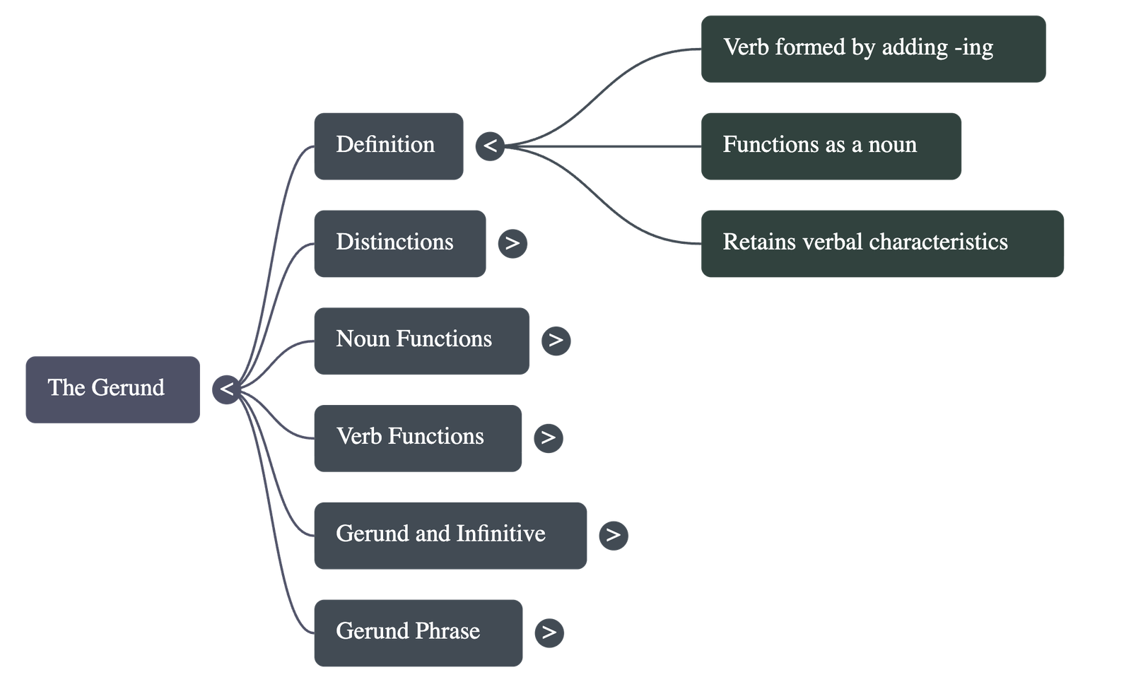 - Definition and Nature: A gerund is a verbal noun formed by adding -ing to a verb. It functions as a noun while retaining verb characteristics, such as suggesting an action.