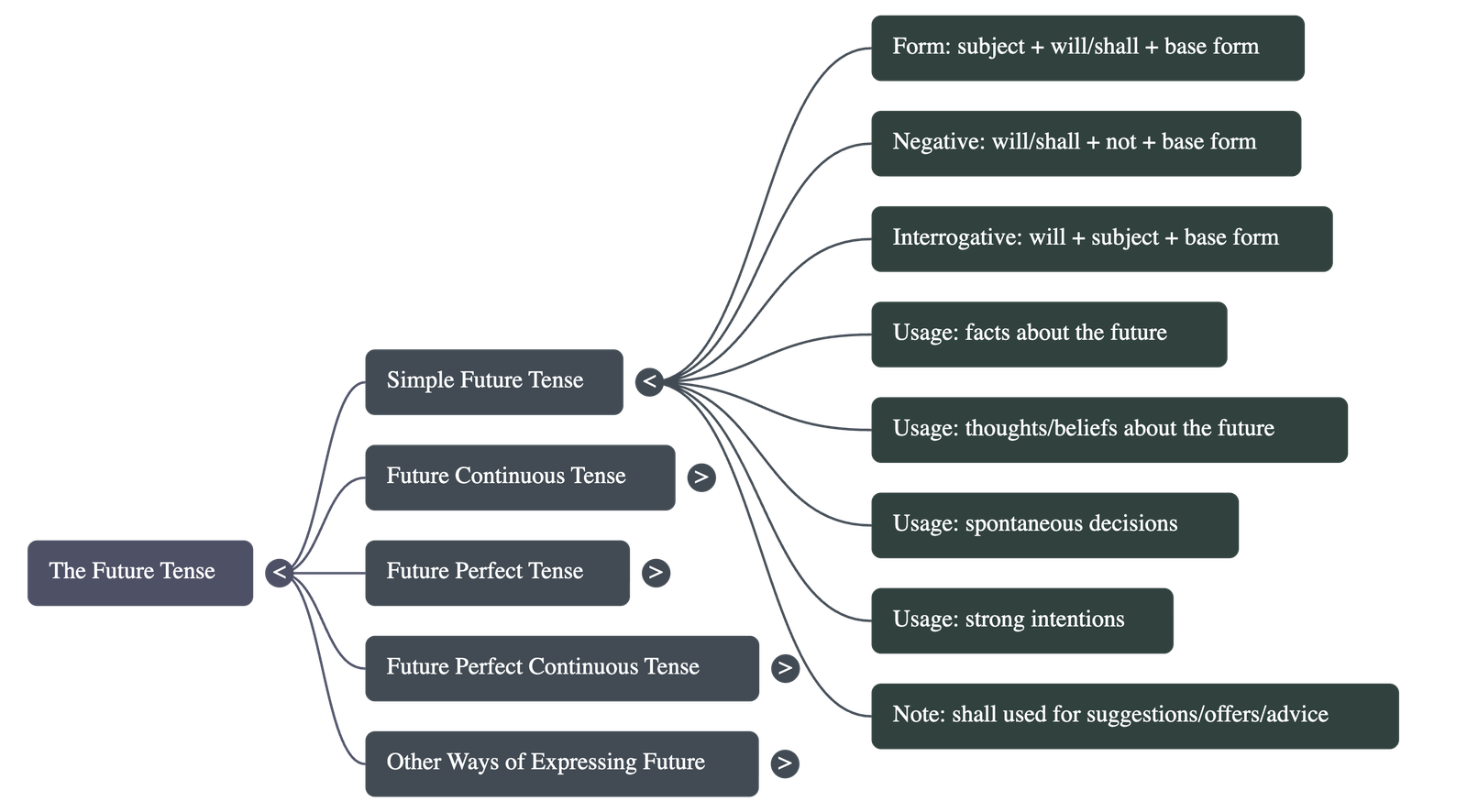 - Form: Subject + will/shall + base form of the verb
