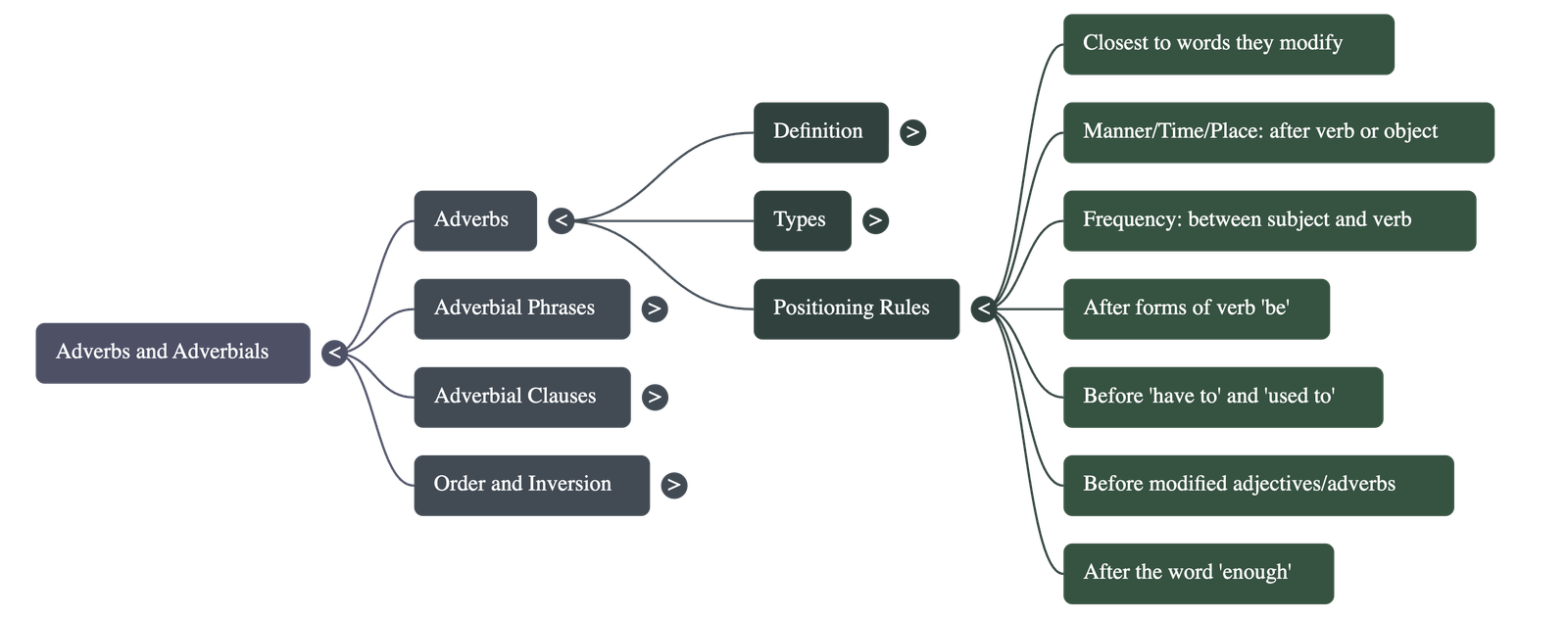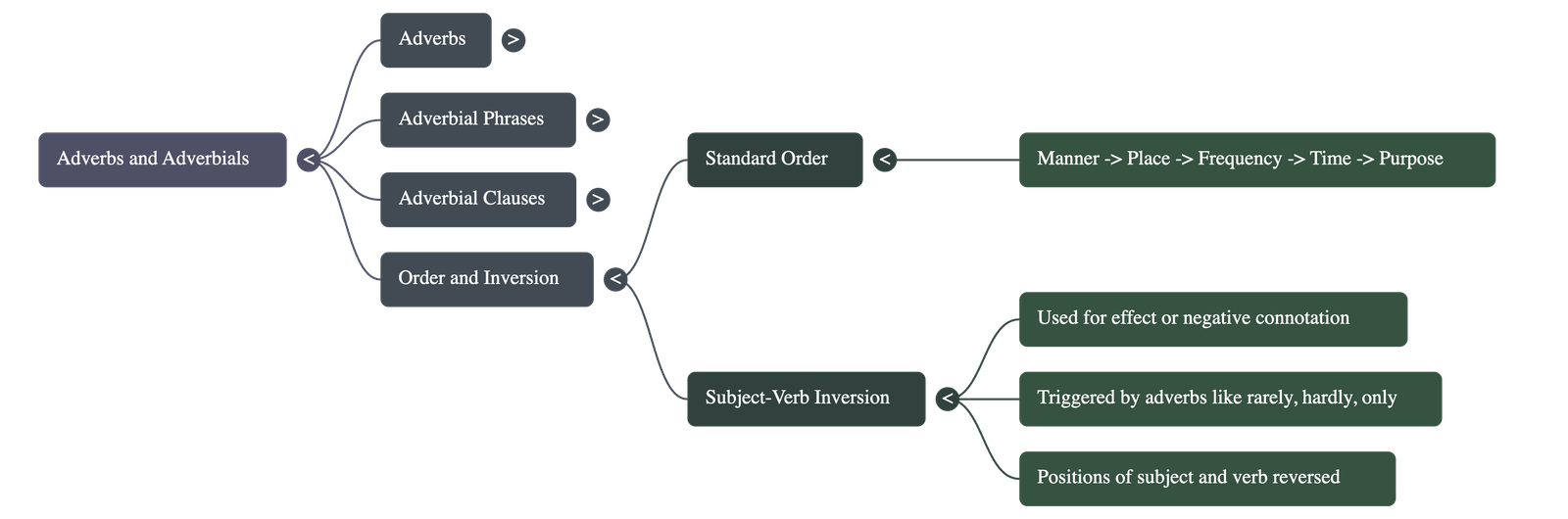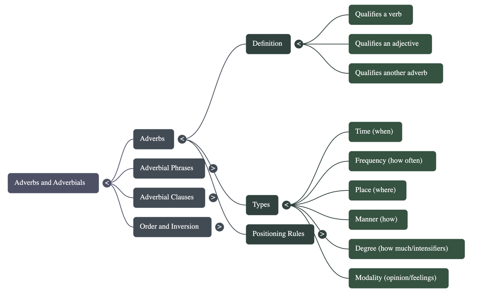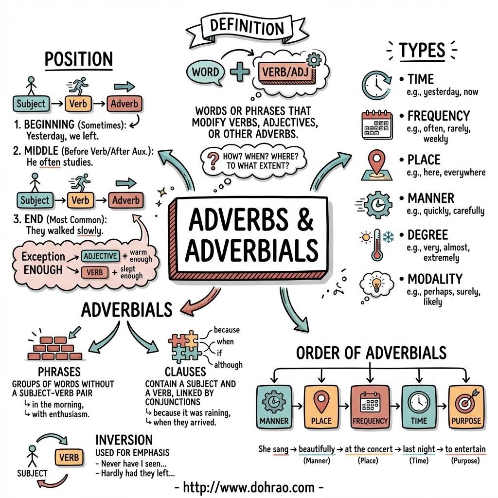 - Adverbials: A broad category encompassing adverbs, adverbial phrases, and adverbial clauses.