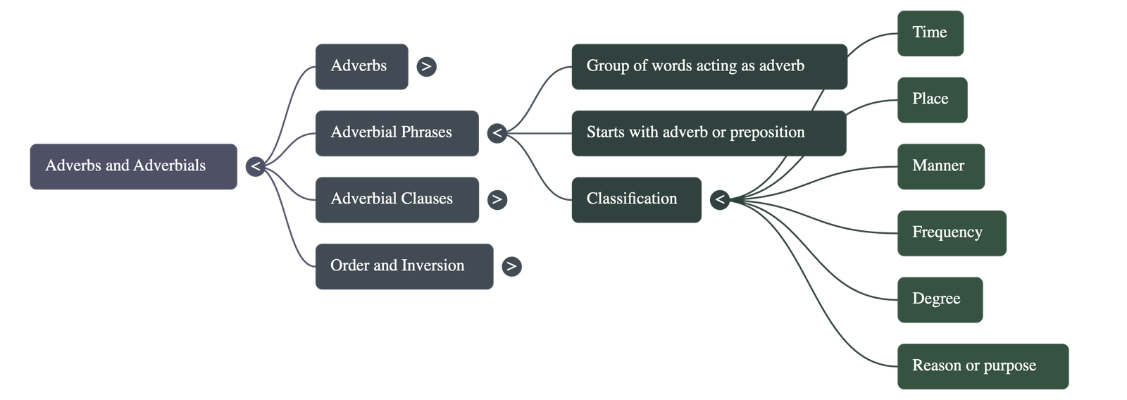 - Adverbial Phrases: Groups of words acting as an adverb, usually starting with a preposition or an adverb.