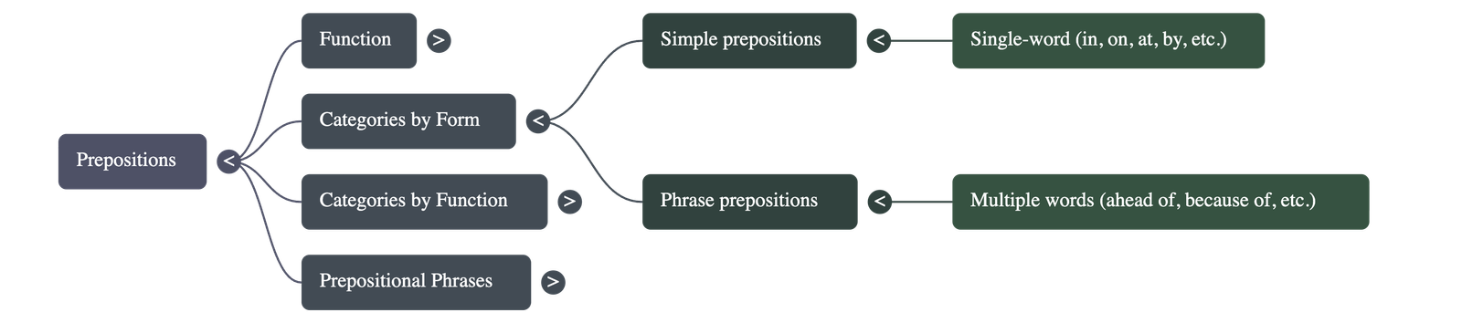 - Phrase Prepositions: Groups of words that function as a single preposition, such as ahead of, because of, in front of, and on behalf of.