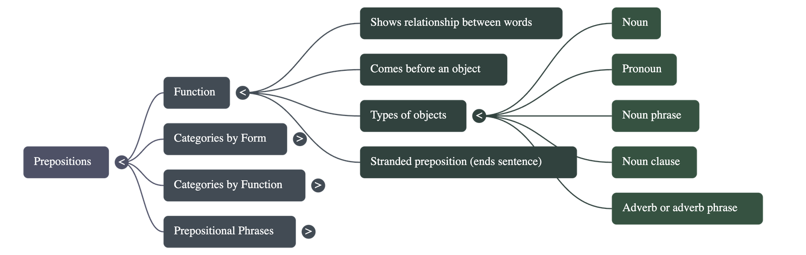 - The Object: The word or phrase following a preposition is called its object. This can be a noun, pronoun, noun phrase, noun clause, or occasionally an adverb.