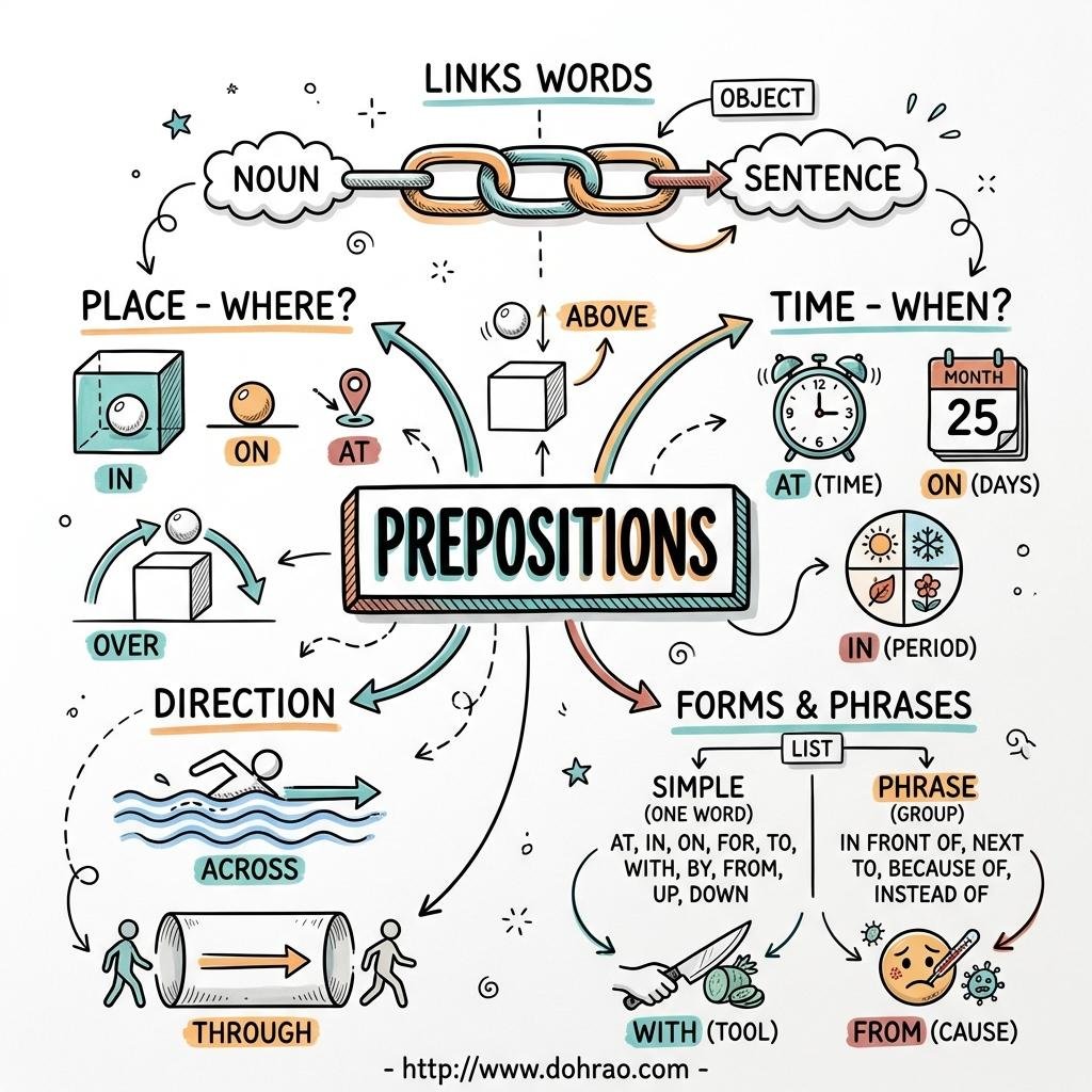 - Prepositions of Place: Used to describe the position of a person or thing. Examples include above, below, beside, and near.
