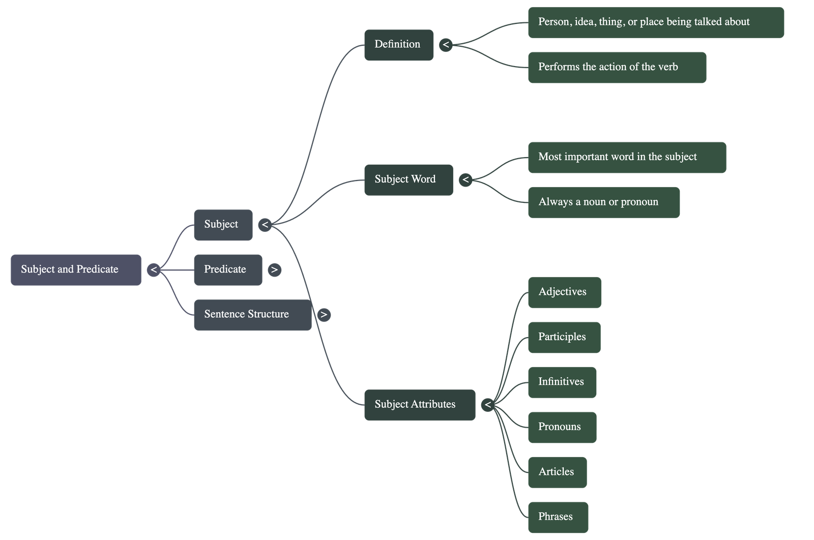 Analogy To understand this structure, think of a sentence like a directed play: the Subject is the lead actor (the "who" or "what"), the Attributes are the actor's costume and description, and the Predicate is the action they perform on stage to tell the story.