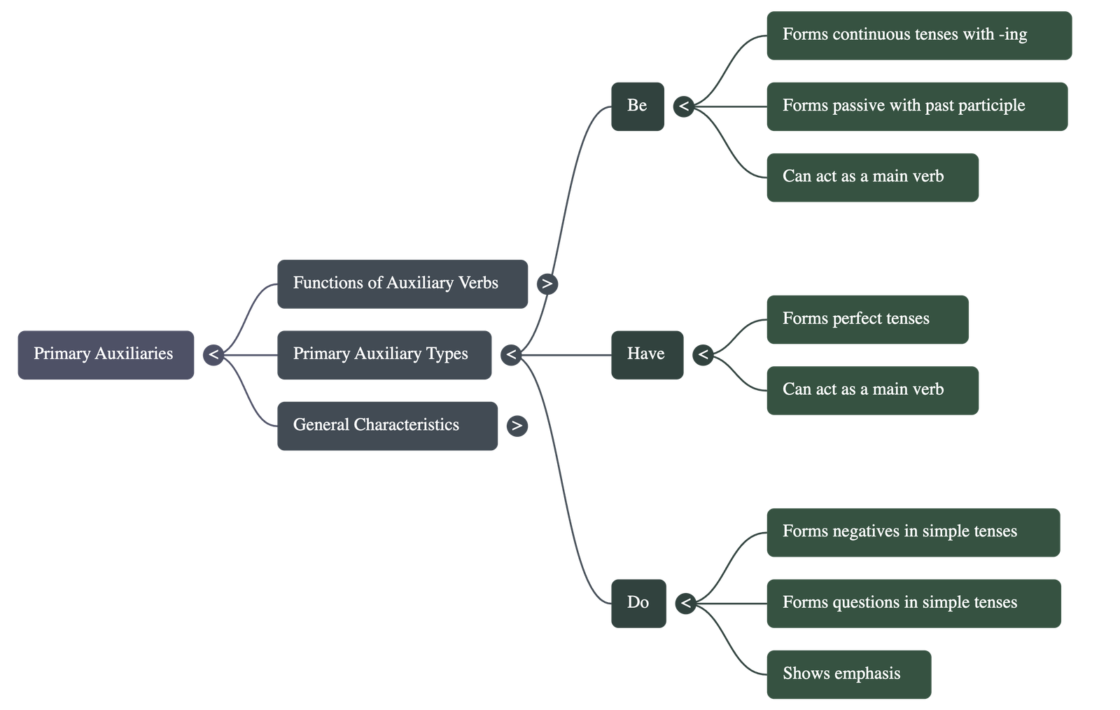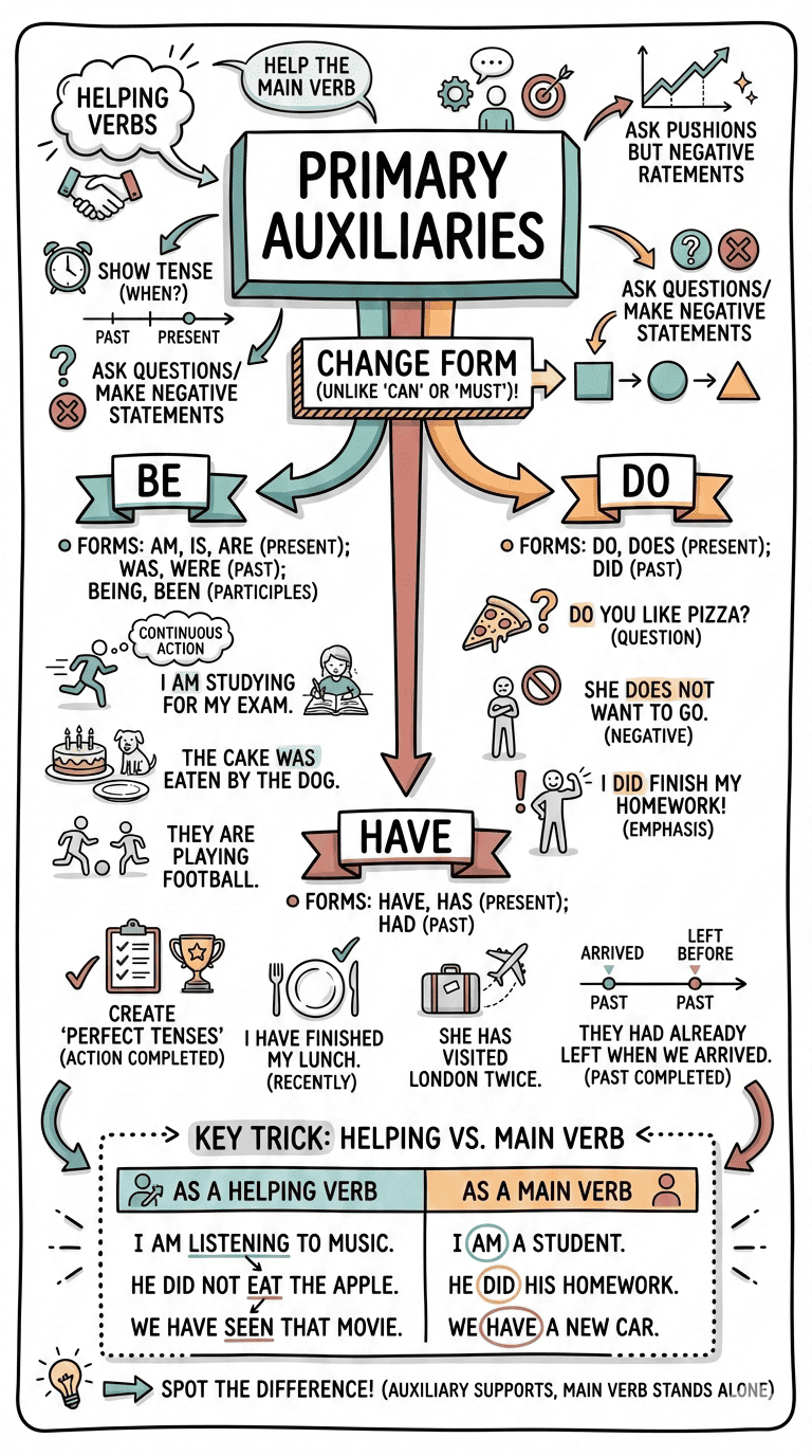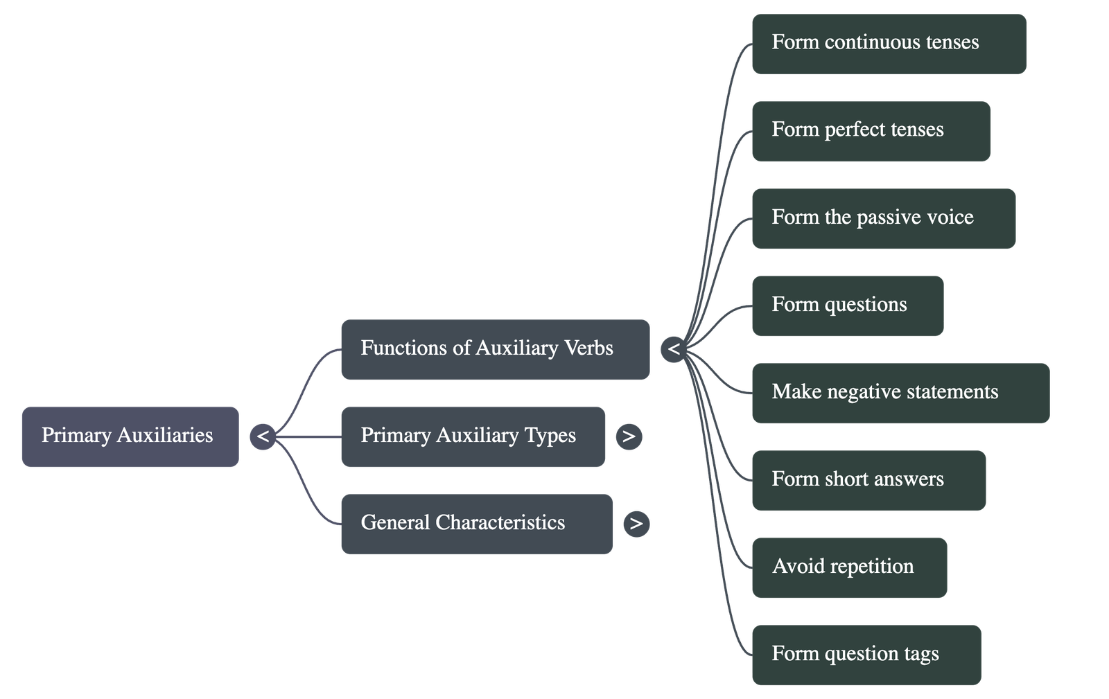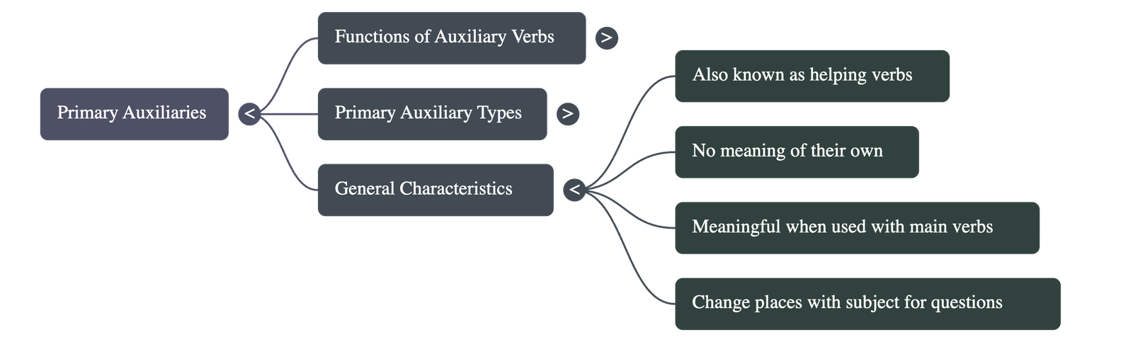 - Dual Roles: Primary auxiliaries are unique because they can also act as main verbs in certain contexts, such as in the sentence "I have my French class in the evening".