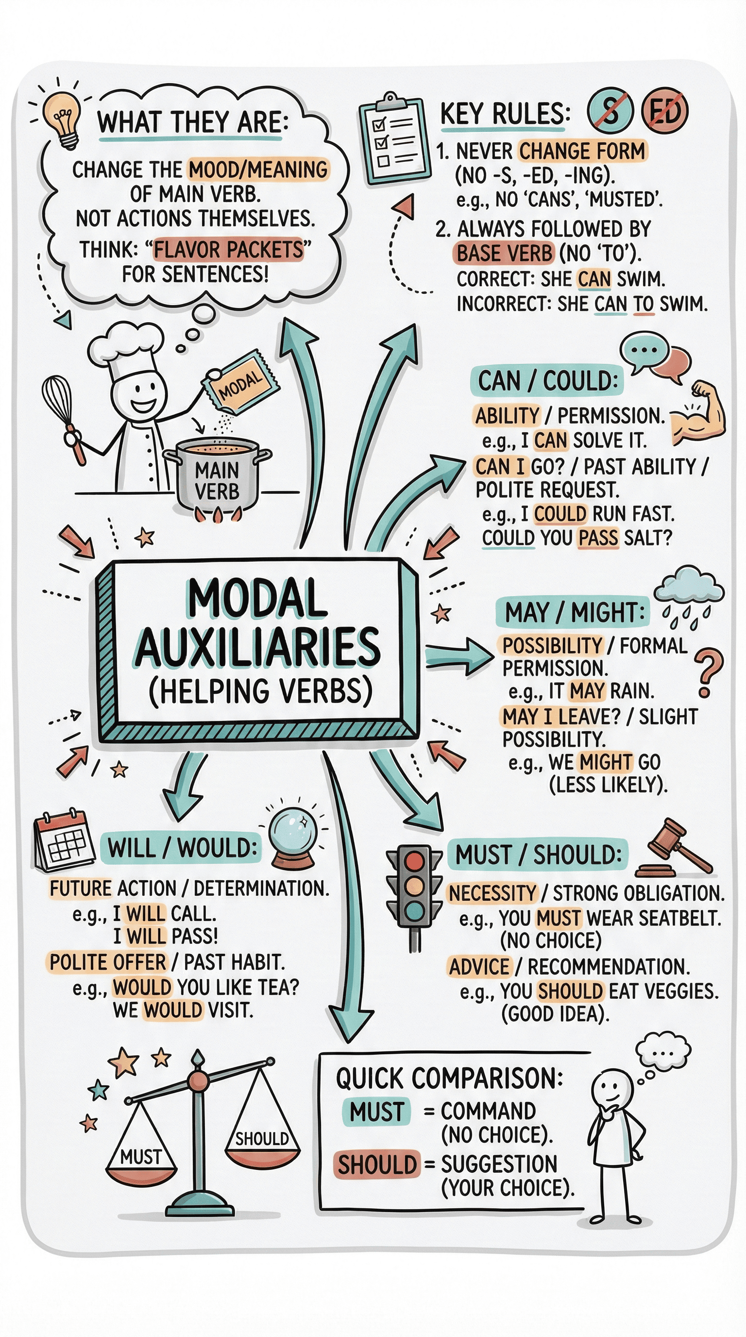 Analogy You can think of modal verbs as the "mood settings" on a camera. The main verb is the subject you are filming, but the modal verb changes the "lens" through which you see the action—shifting the scene from a simple statement of fact to one of possibility, necessity, or permission.