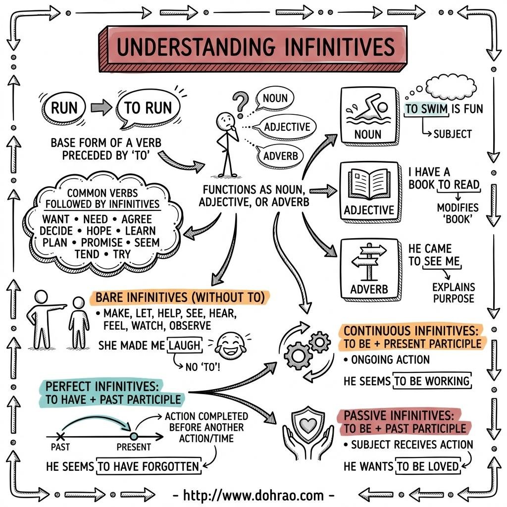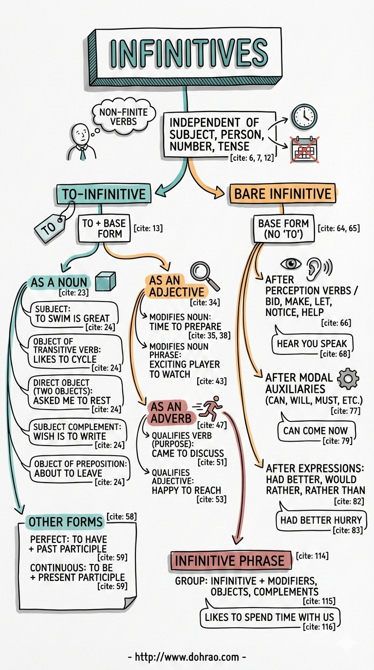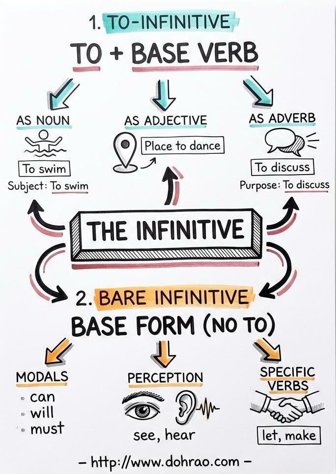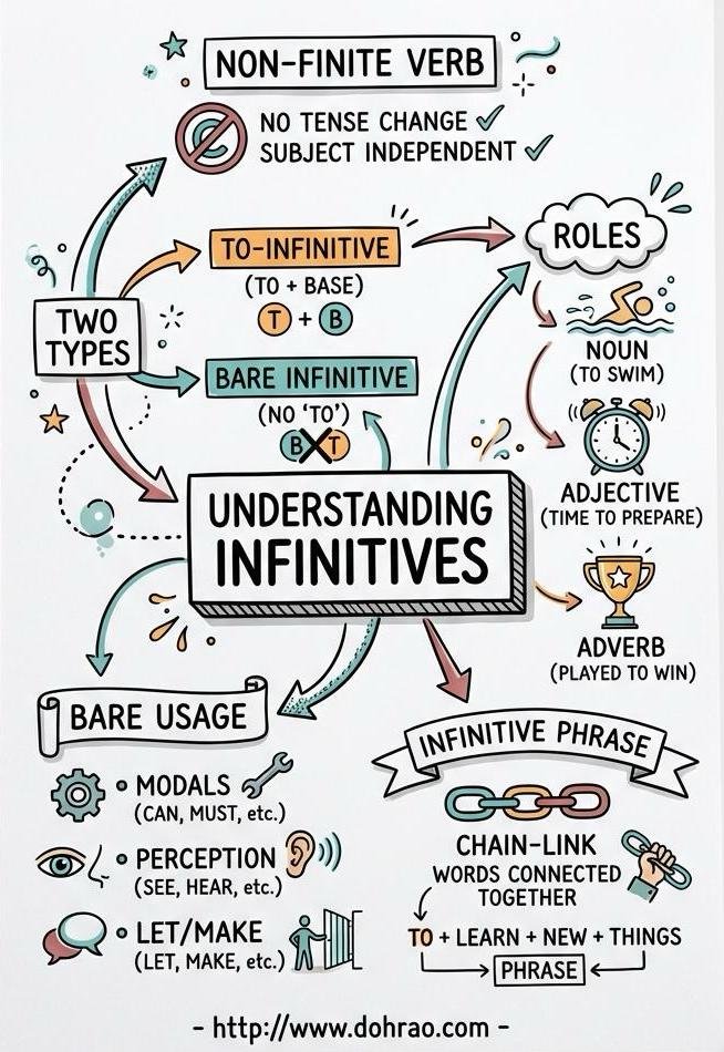 - Two Primary Types: The chapter categorises infinitives into the to-infinitive (to + base verb) and the bare infinitive (base verb without 'to').
