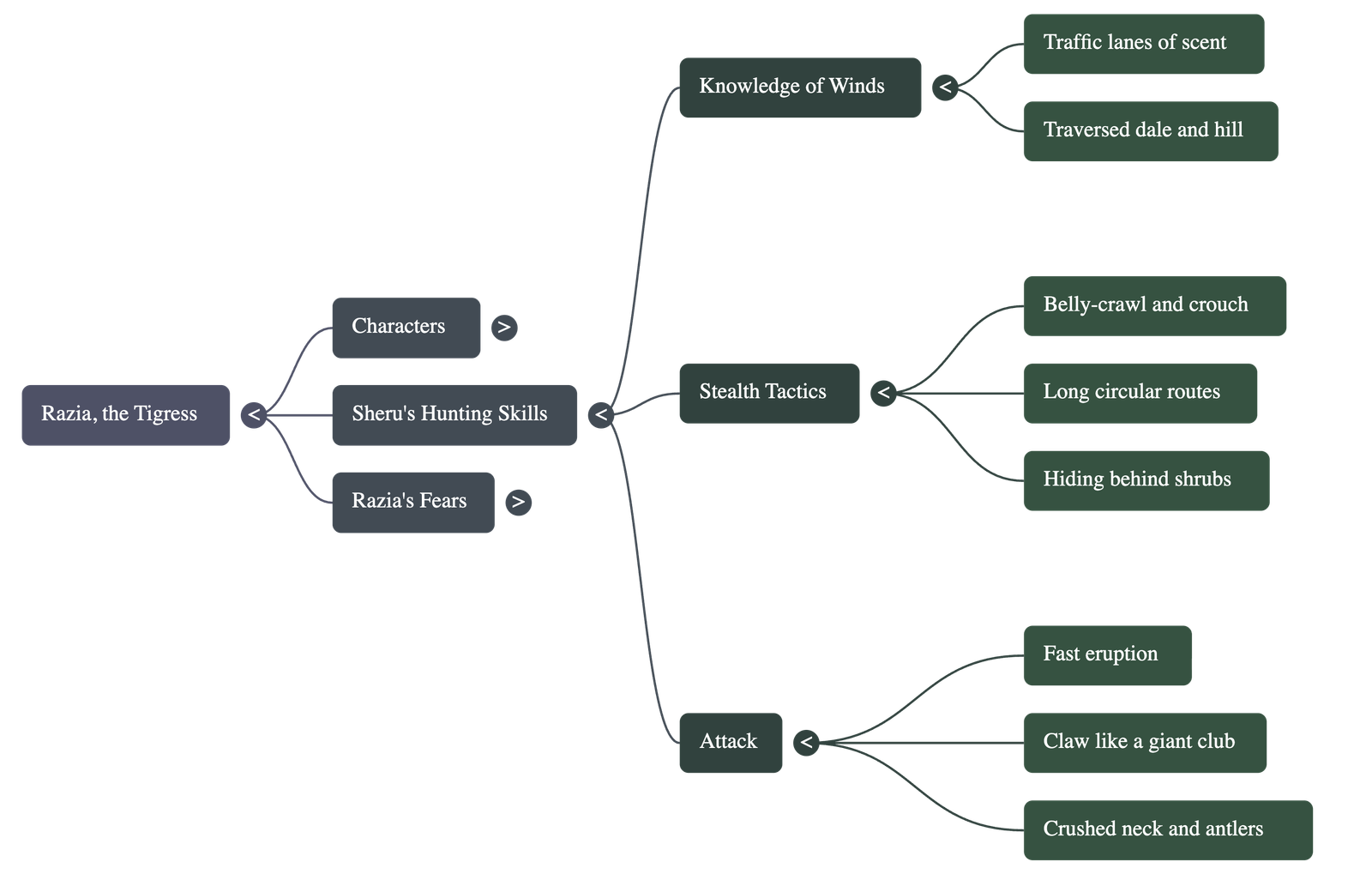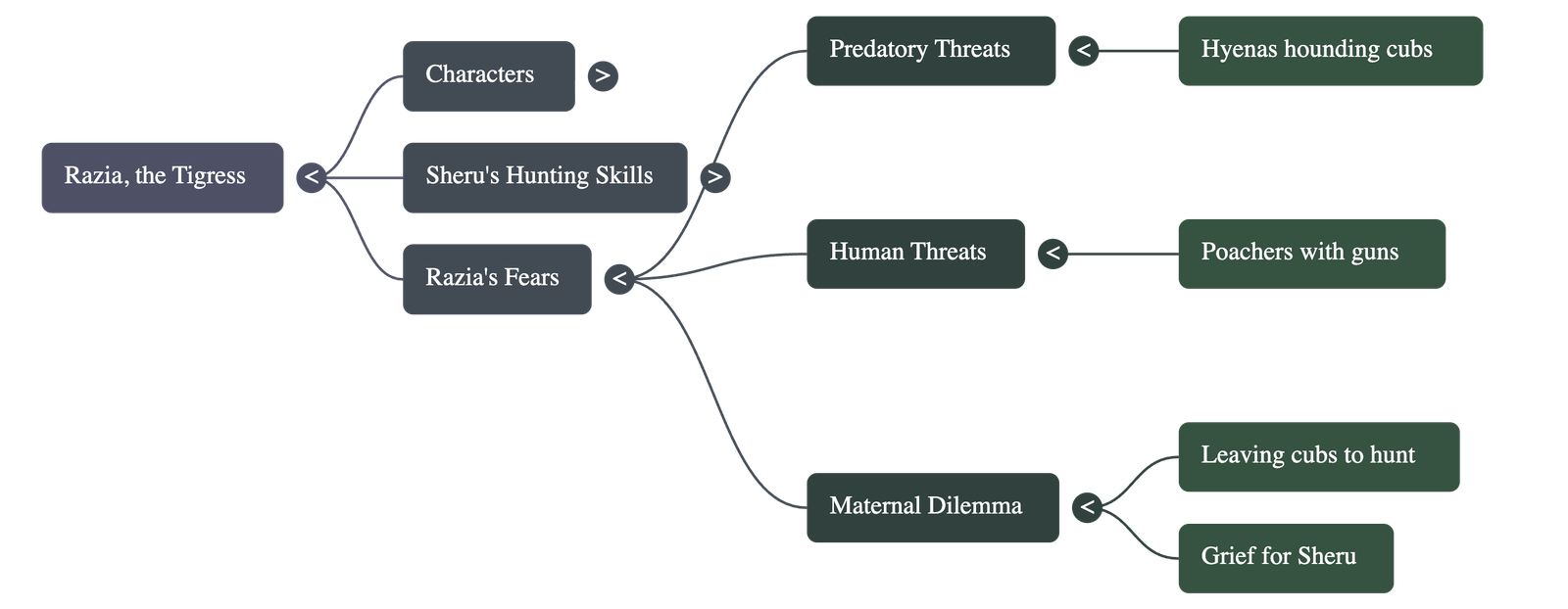 Human Intervention: Razia’s maternal dread is further intensified by the threat of poachers with guns. She is caught between the physiological necessity of hunting and the "greater dread" that humans might return to harm her cubs while she is not there to defend them.