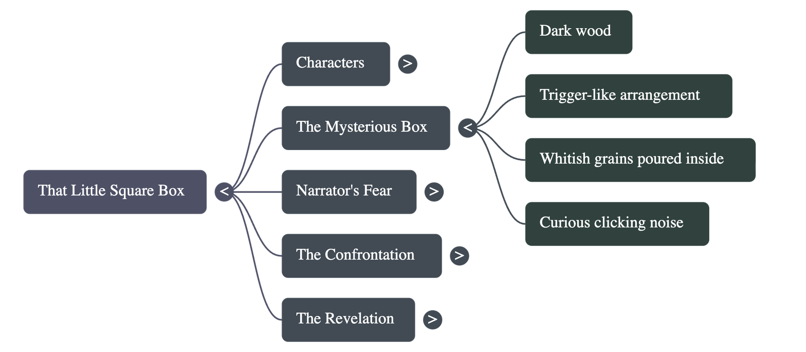 - The narrator observes the box, which resembles a pistol case but is taller, featuring a trigger mechanism and a small opening.