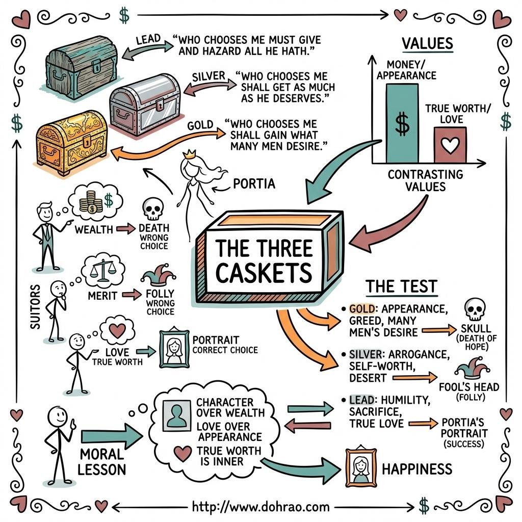 - The Result: He finds Portia's portrait inside, along with a scroll confirming his victory.