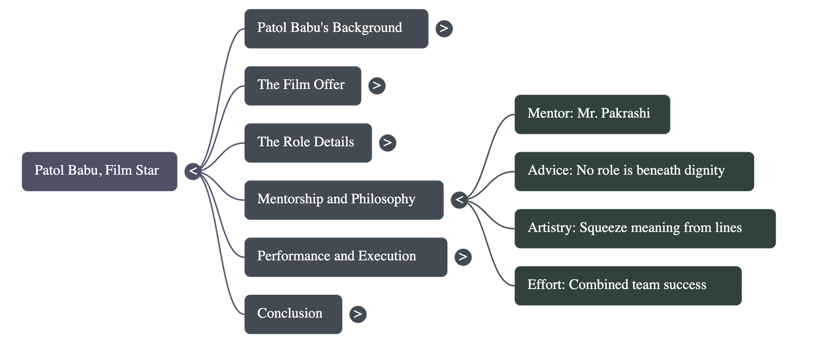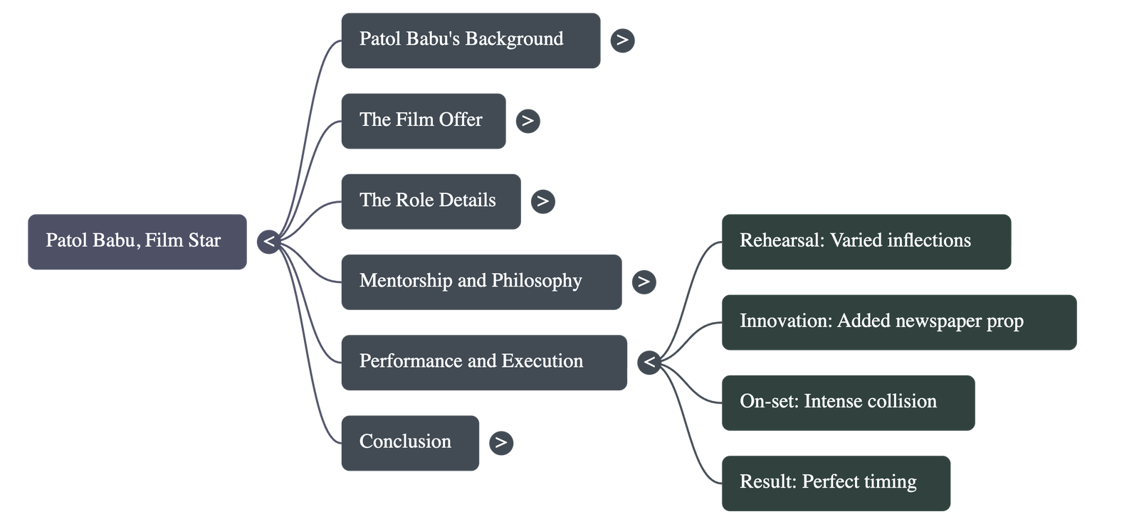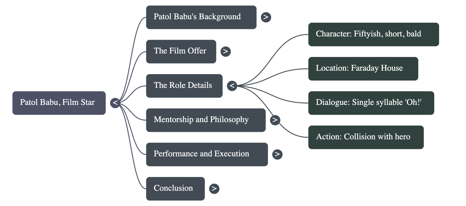 - Initial Disappointment: Upon arriving at the film set, Patol Babu is disappointed to learn that his role is very minor and his only dialogue is the single word "Oh!". He initially feels that such a small part is beneath his dignity.