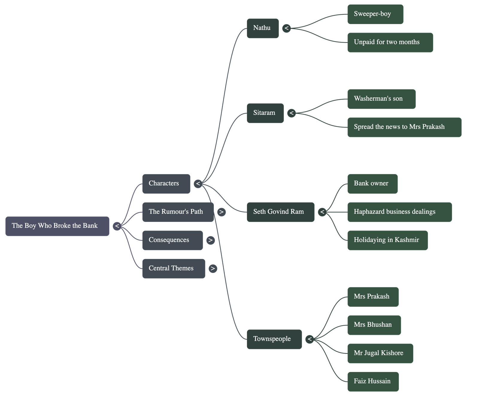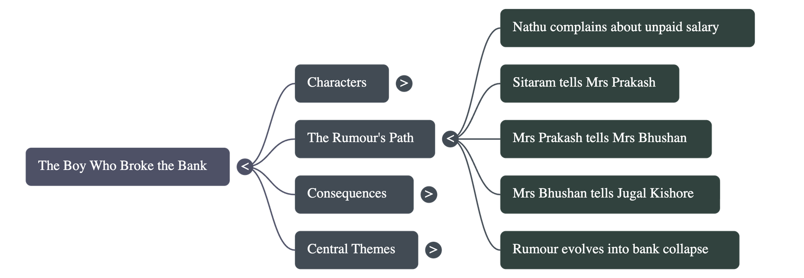 - The Origin of the Rumour: Nathu mentions his frustration to his friend Sitaram, the washerman’s son. Sitaram, while trying to help Nathu find a new job, tells a customer, Mrs Prakash, that the bank is not paying its employees.