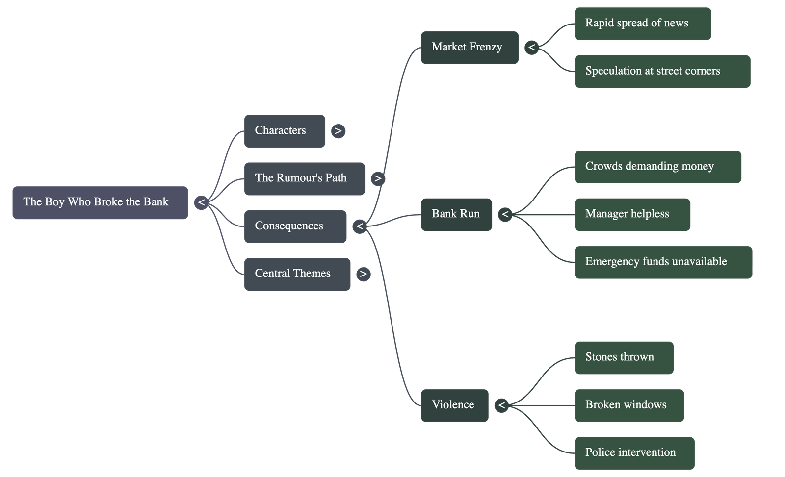 - Financial Collapse through Panic: The bank runs out of ready money (cash on hand) due to the sudden rush of withdrawals. The manager's attempts to calm the crowd fail, and the situation turns violent as bricks are thrown and windows are smashed.