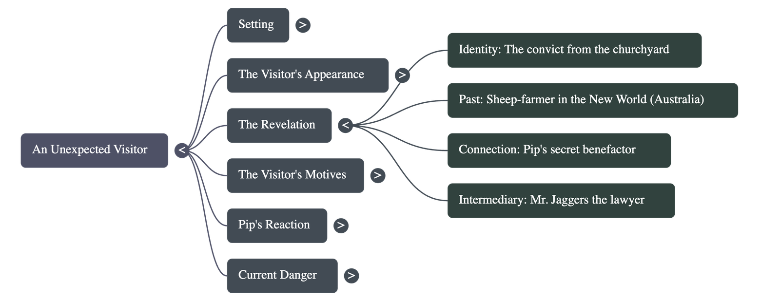 - • The Great Reveal: The visitor reveals that he has been a successful sheep-farmer and stock-breeder in Australia (the "New World"). He confesses that he is Pip's secret benefactor, having sworn that every guinea he earned would go toward making Pip a gentleman.