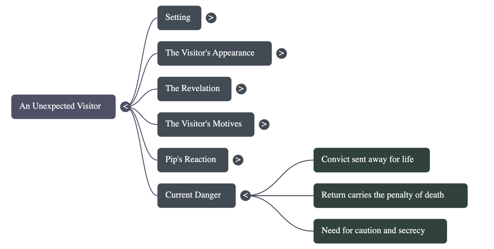 - • A Dangerous Return: The benefactor explains that he was "sent for life" and that returning to England is a capital offense. If caught, he faces the death penalty, placing Pip in the position of being responsible for the man’s life.