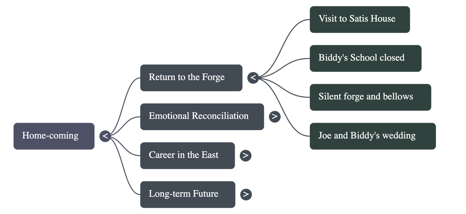 - • Return to the Forge: Following a period of recovery, the narrator returns to his childhood home with a penitent heart, intending to disclose his feelings to Joe.