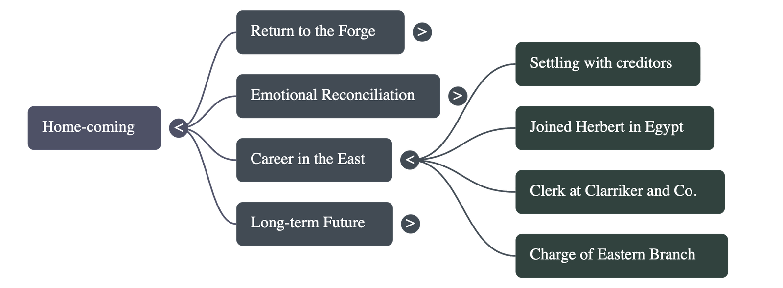 - • New Beginnings Abroad: He joins Herbert abroad, starting as a clerk for Clarriker and Co. Within four months, he takes on significant professional responsibility in the Eastern Branch.