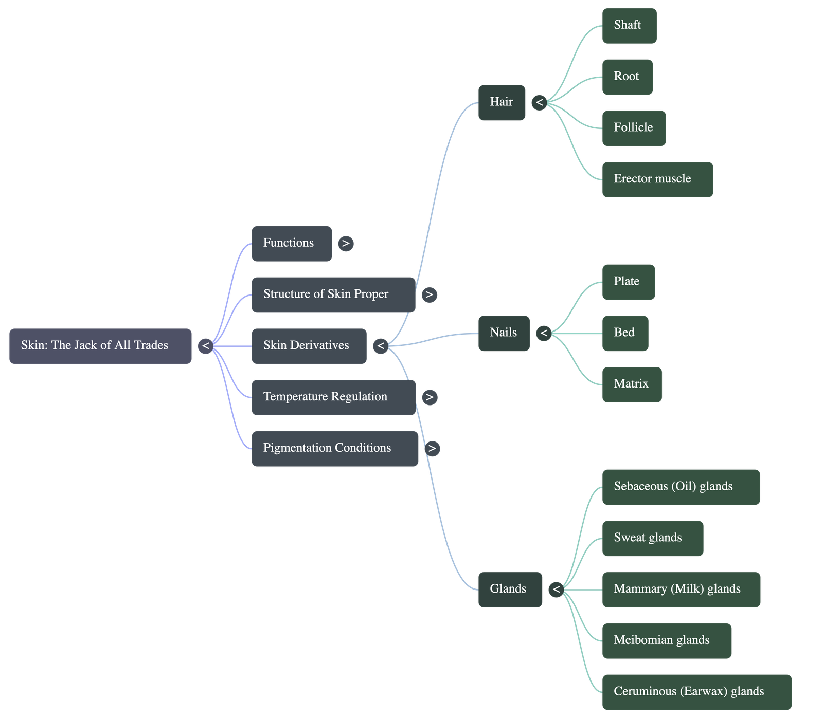 - Nails: Hard, keratinized structures made of a plate, bed, and matrix. The matrix (whitish half-moon at the base) produces new cells for nail growth.