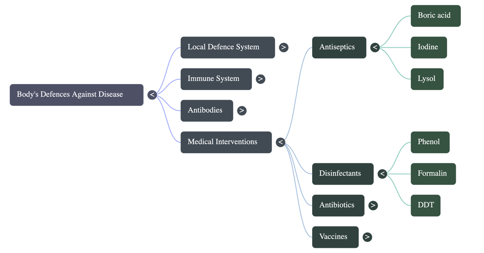 - Antiseptics: Mild chemical substances applied to the living body to kill germs. They do not harm the skin. Examples include Lysol, carbolic acid, iodine, benzoic acid, and mercurochrome in dilute solutions.