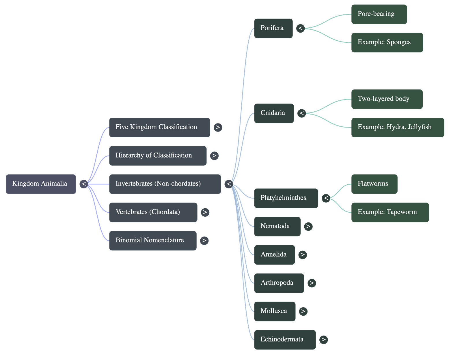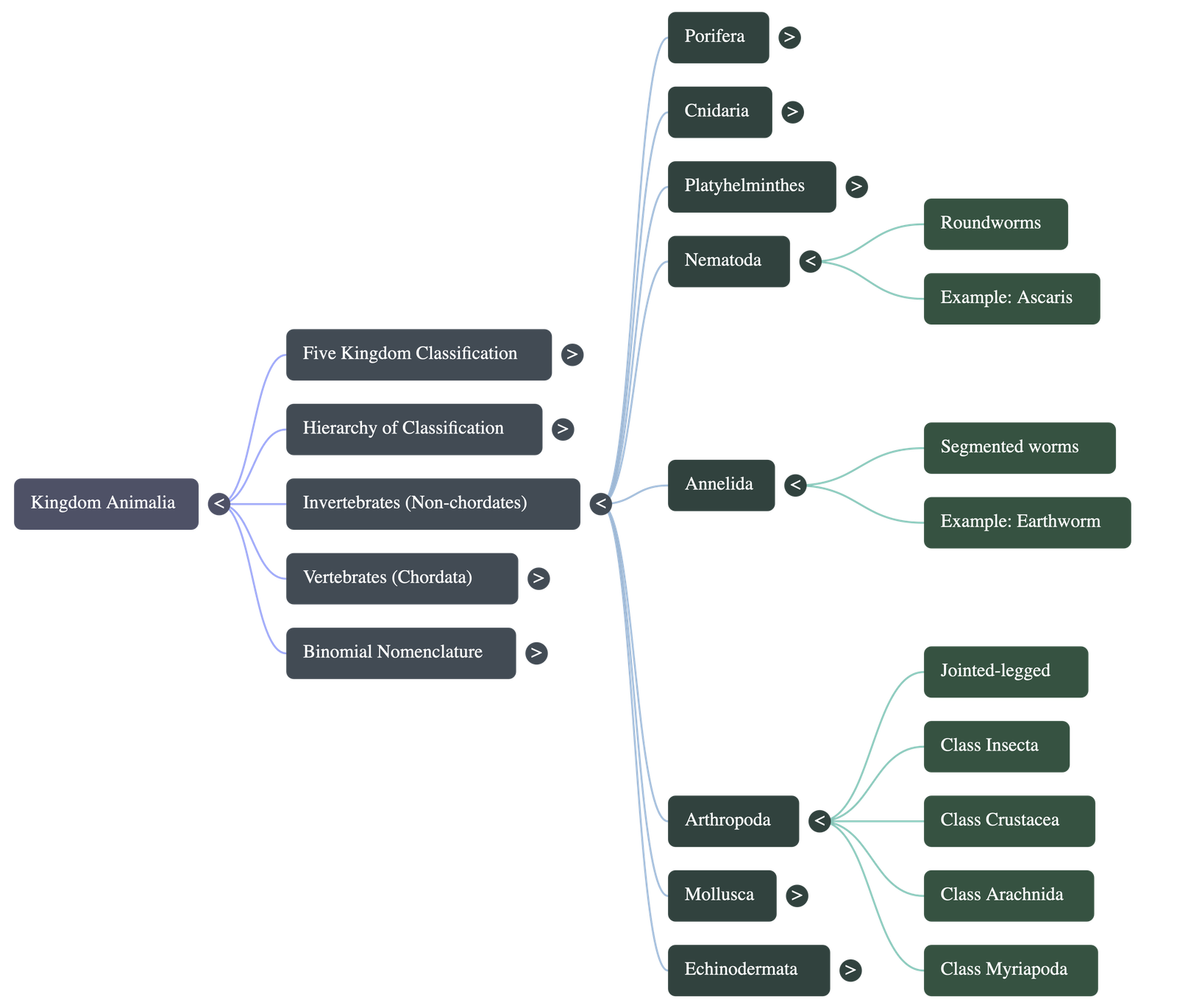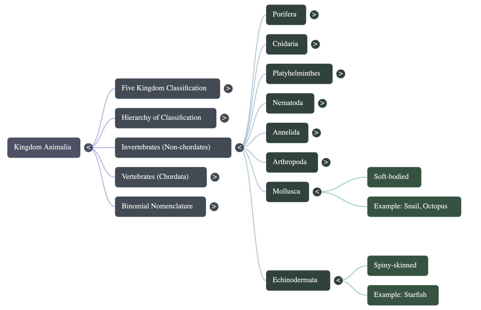 - Mollusca: Animals with soft, unsegmented bodies often protected by a hard calcareous shell. They move using a muscular foot (e.g., Snail, Octopus, Oyster).