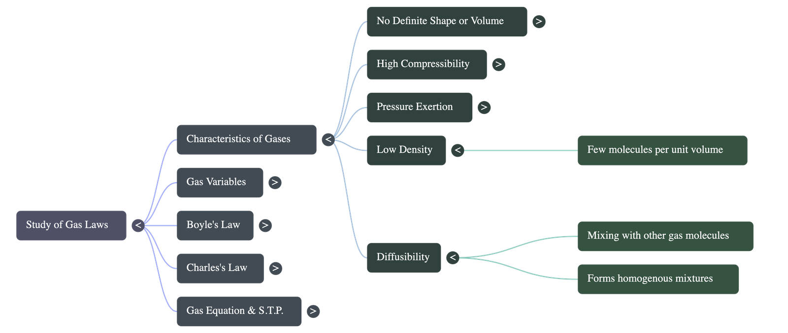 - Diffusibility & Miscibility: Gases readily mix and diffuse into one another to form homogeneous mixtures entirely on their own because of their large intermolecular spaces.
