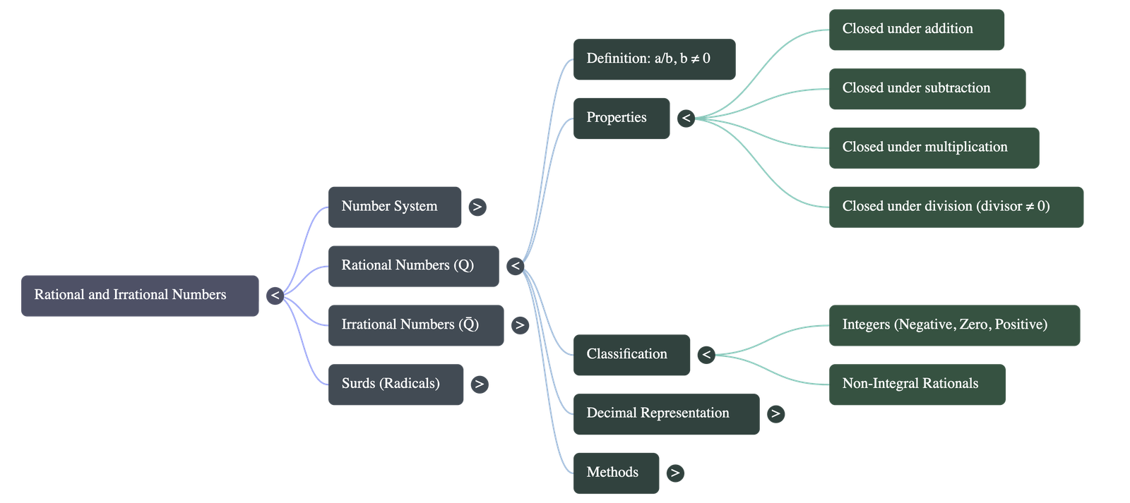 - Rational numbers further branch into Integers (Positive, Negative, and Zero) and Non-Integral Rationals (fractions).