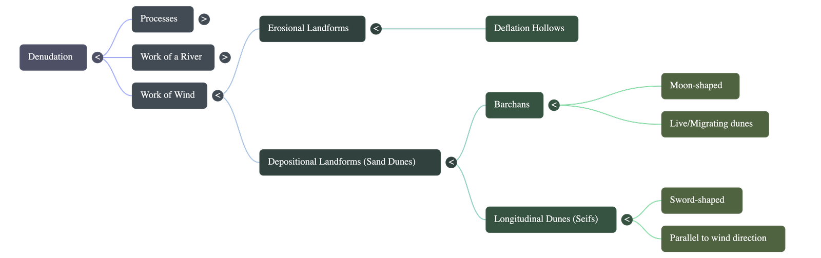 - Sand Dunes: Hills of accumulating sand that can be active (shifting) or inactive (fixed by vegetation).