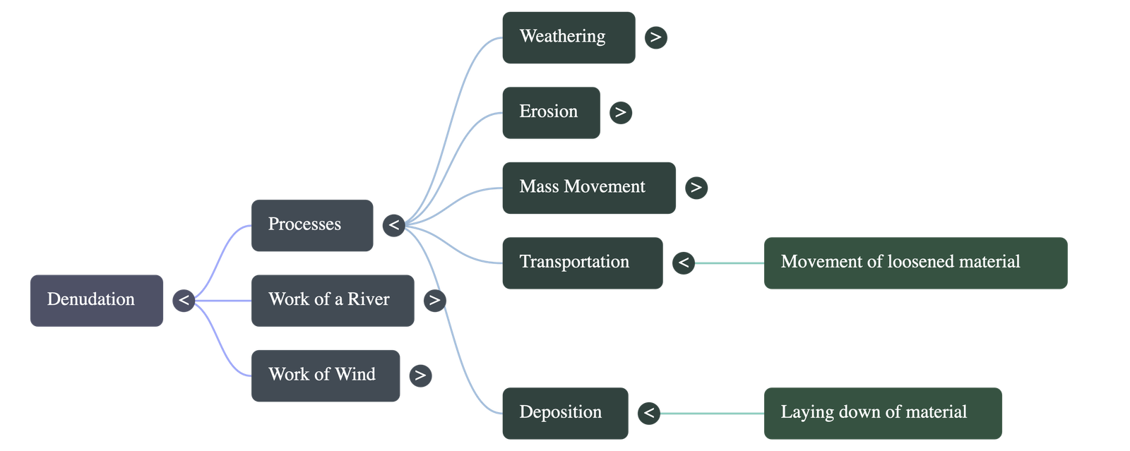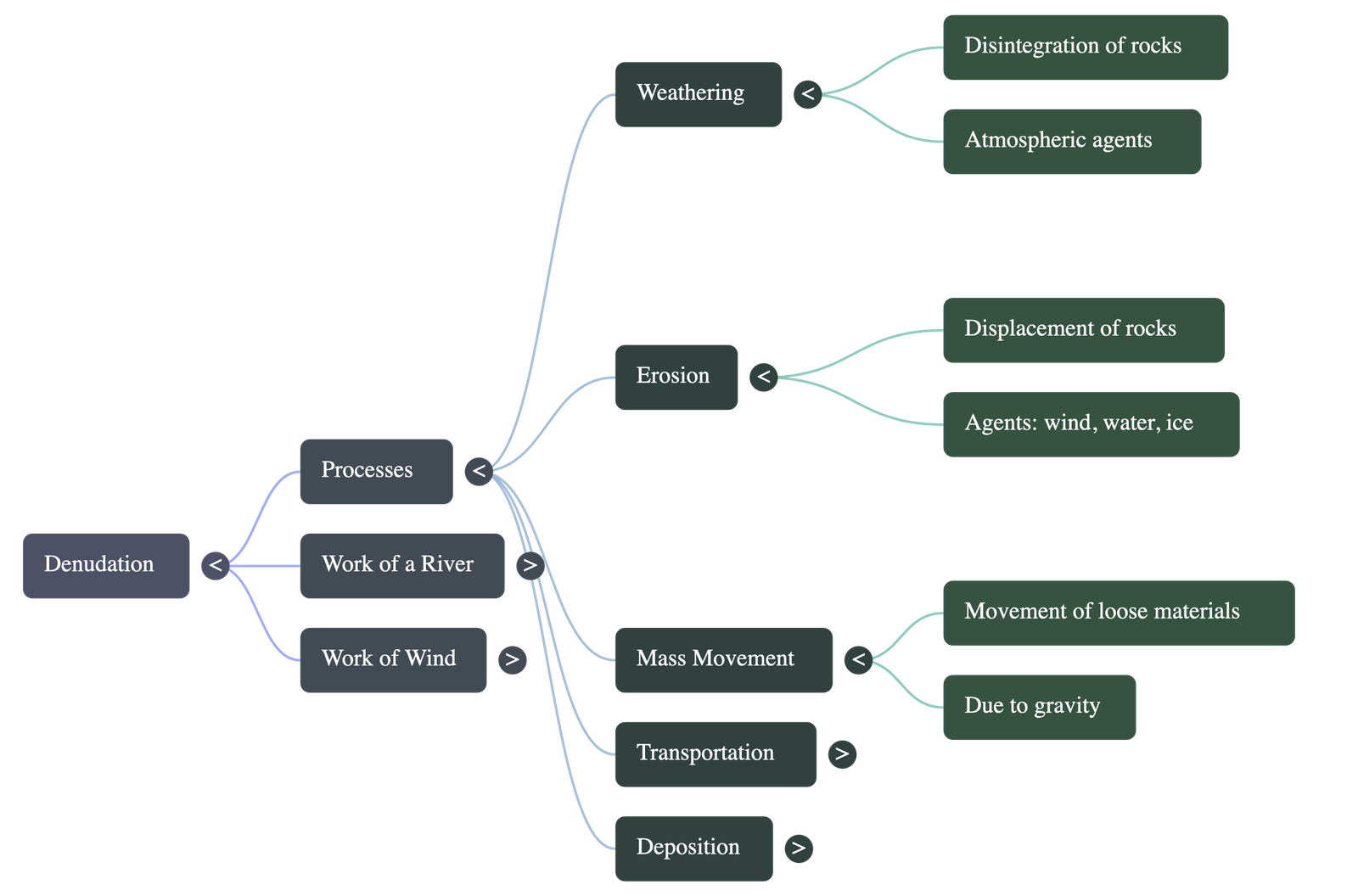 - Meaning: Denudation is the comprehensive process of breaking and removing rocks from the earth's surface. It continuously wears away landmasses, lowers the level of land, rounds exposed rock surfaces, and levels mountain peaks.