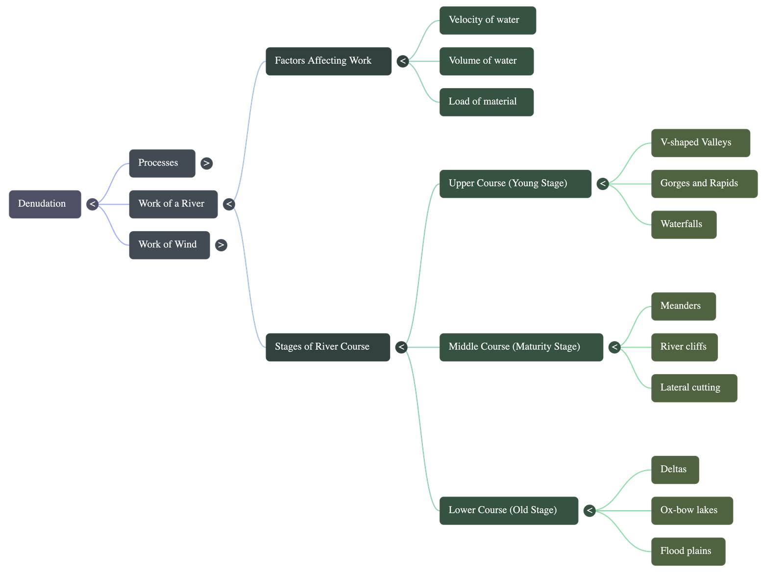- Load: The physical materials transported by the river dictate the rate of deepening valleys and forming new landforms.