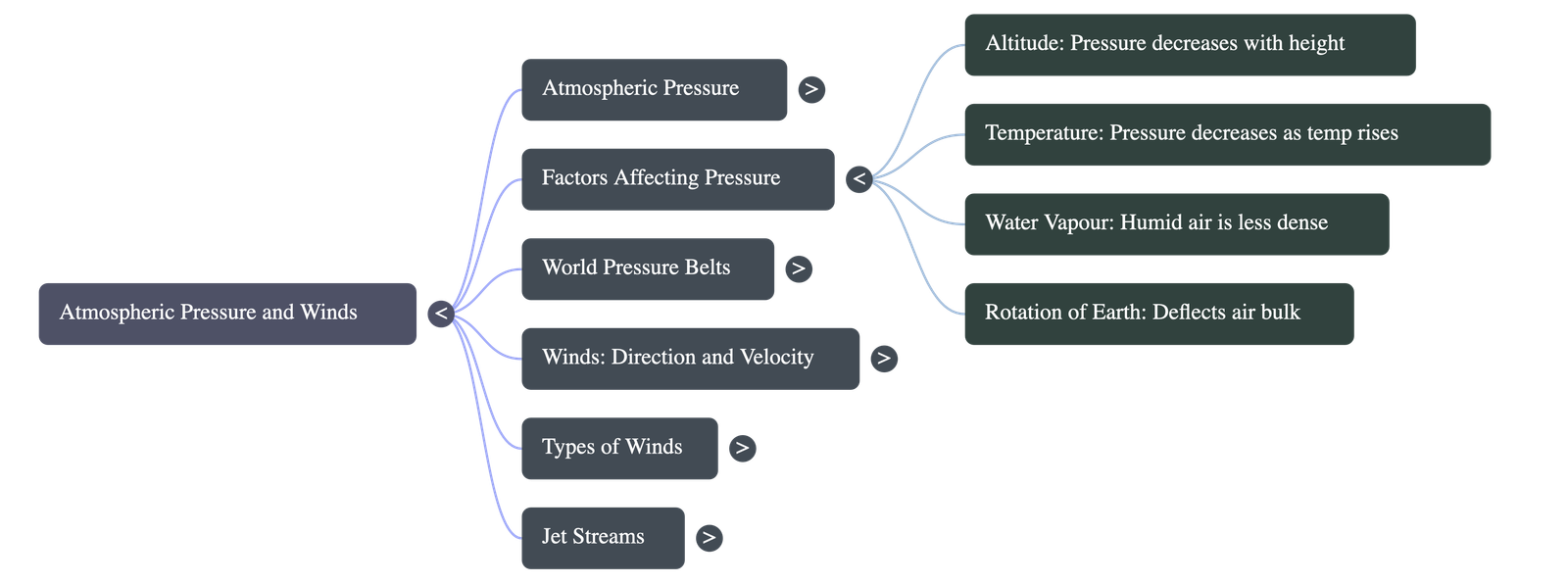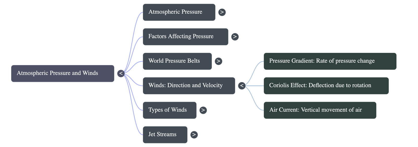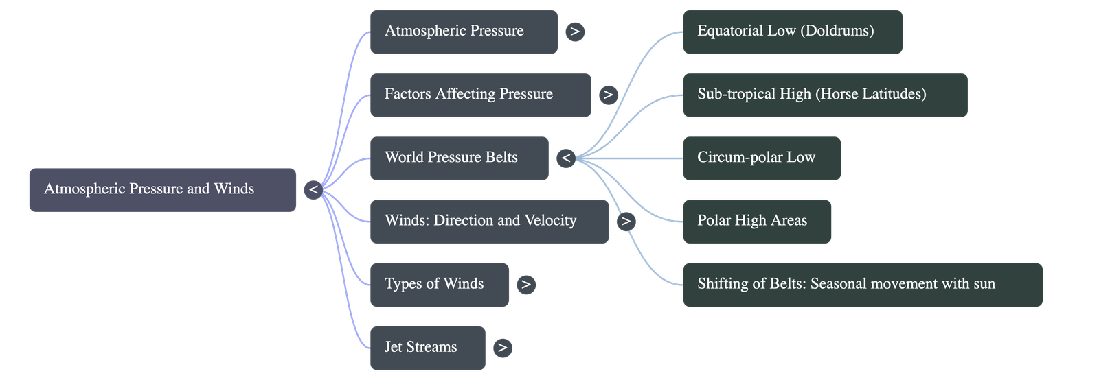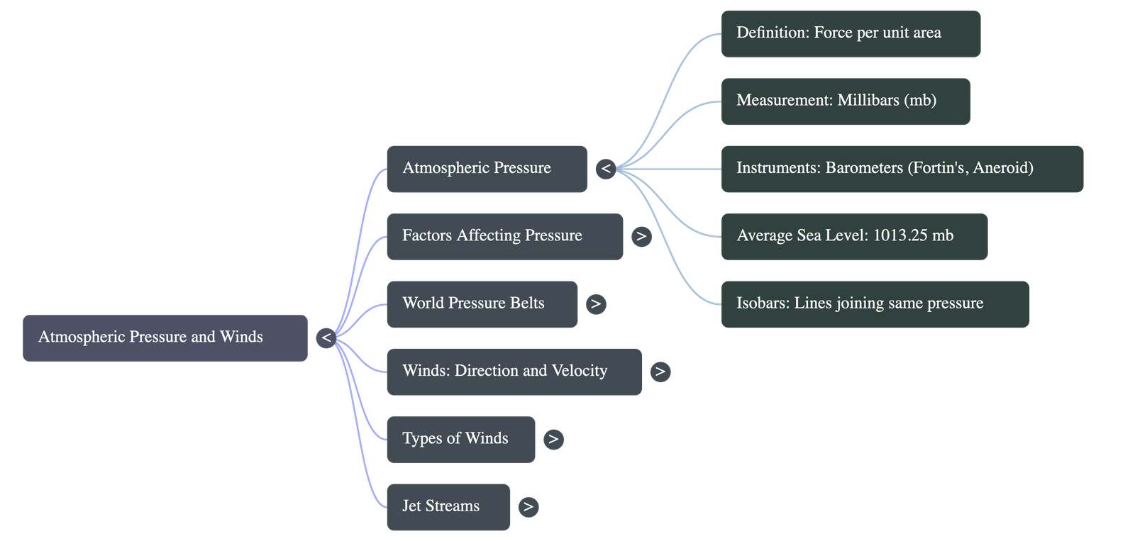 - Measurement: Pressure is measured in millibars (mb) using barometers (such as Fortin's Barometer and Aneroid Barometer). The average atmospheric pressure at sea level is 1013.25 mb.