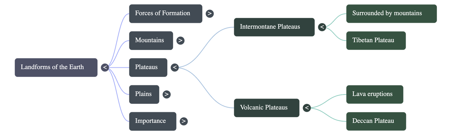 - Intermontane Plateaus: The highest and most extensive types, surrounded by hills and mountains on all sides. Formed along with fold mountains. Examples: Tibetan Plateau (world's highest), Columbian, Bolivian, Peruvian.