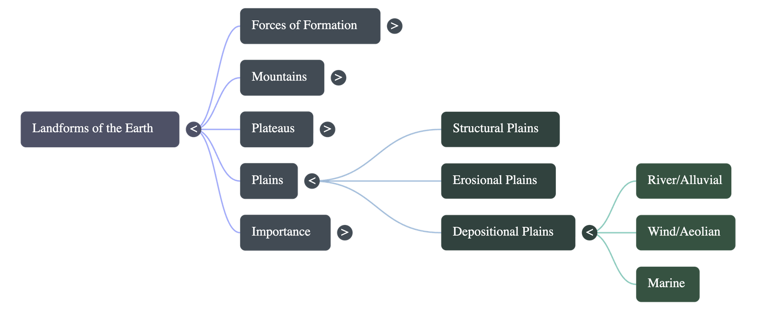 - Depositional Plains: Formed by the deposition of materials brought by various agents: