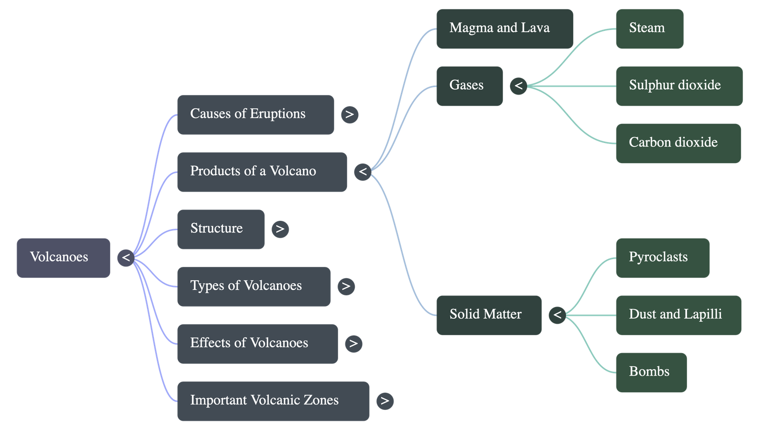 - Gases: Steam is the most abundant gas, forming huge clouds that cause rainfall. Other ejected gases include hydrogen sulphide, sulphur dioxide, carbon dioxide, and hydrogen.