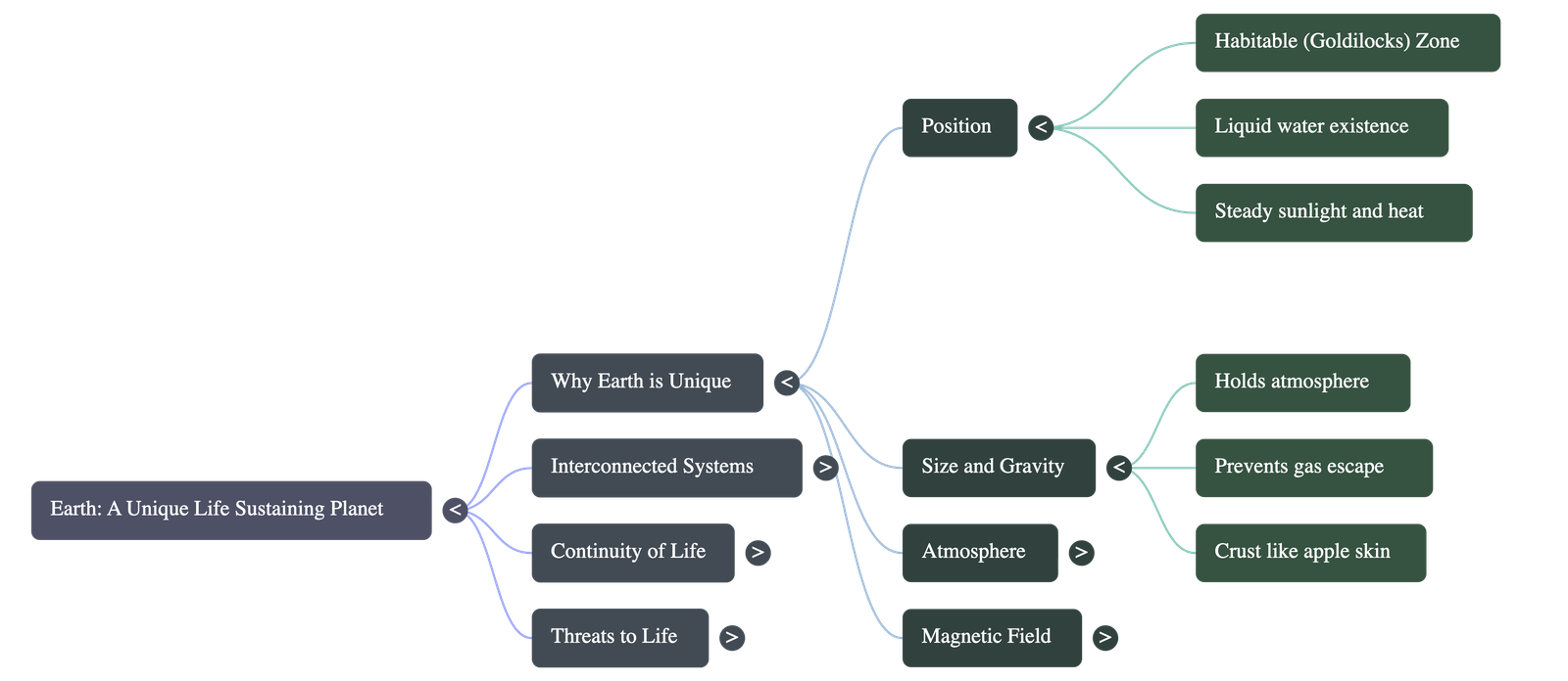 - Size and Gravity: Earth is large enough to have sufficient gravity to hold onto its atmosphere, but not so massive that its gravity crushes living beings.