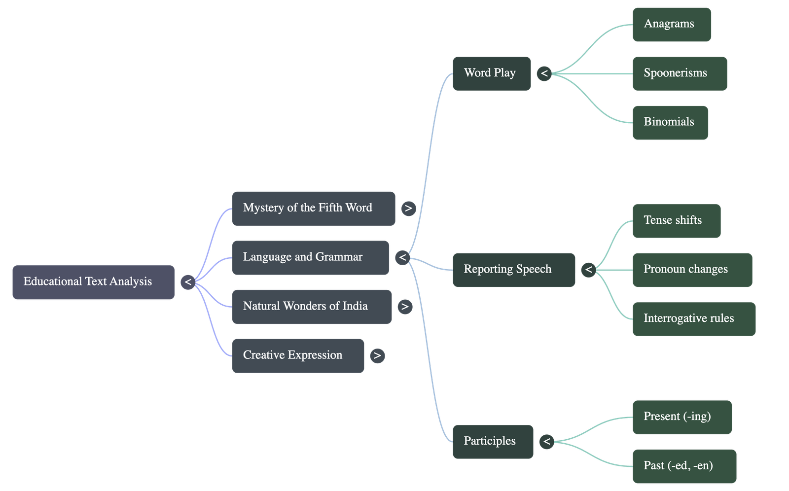 - • Vocabulary Building: Activities involving anagrams, crosswords, spoonerisms (swapping initial letters of words), phrasal verbs, synonyms, and binomials (fixed word pairs like "hide-and-seek").