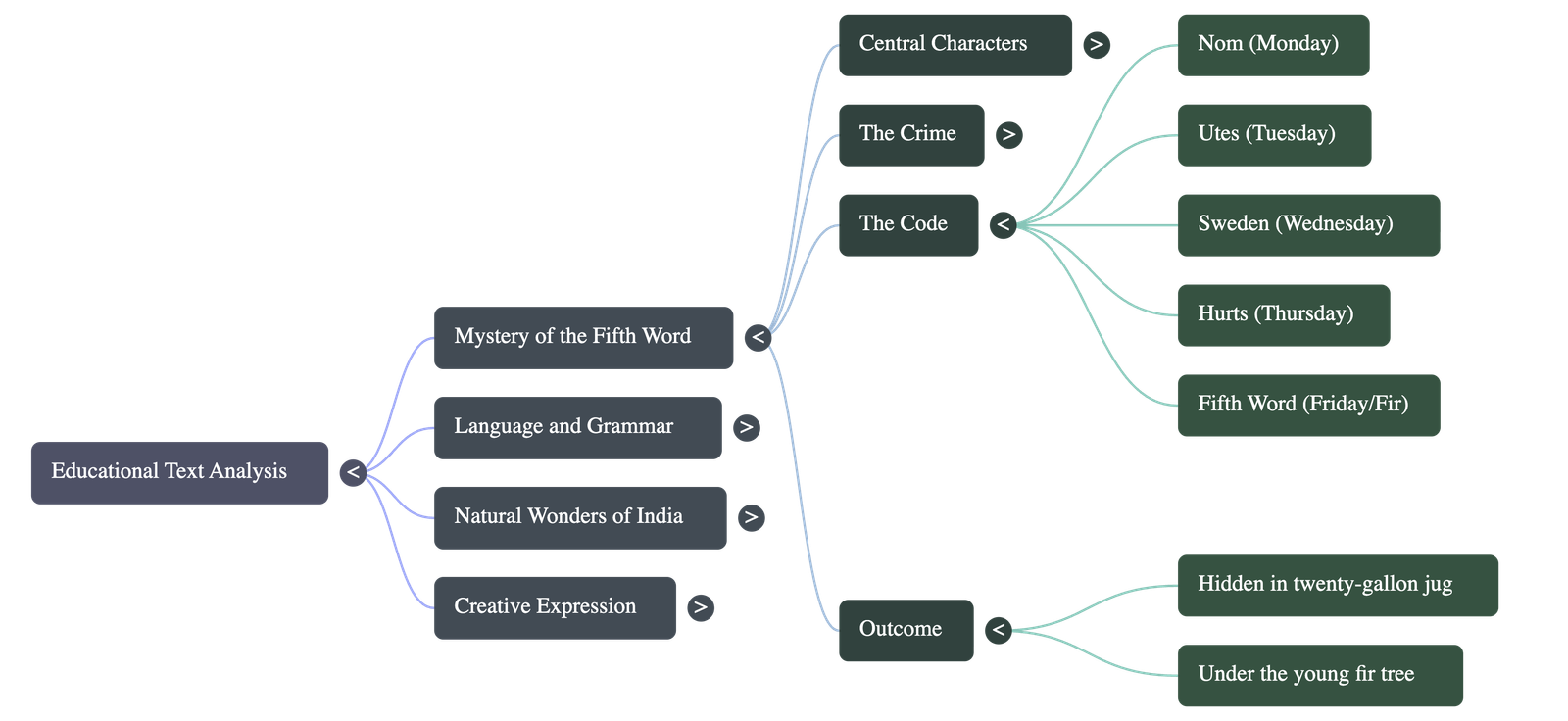 - • The Solution: Leroy realizes Nolan removed the letters "d-a-y" from the days of the week. "Nom" stands for Monday, "Utes" for Tuesday, "Sweden" for Wednesday, and "Hurts" for Thursday. The missing fifth word is Friday, which translates to "Fir" without "d-a-y".