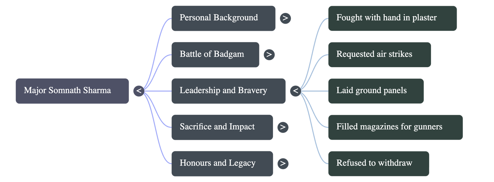 - • Vastly outnumbered by a ratio of seven to one, Major Sharma moved fearlessly across the battlefield, directing fire and manually filling magazines for his gunners with his one good hand.