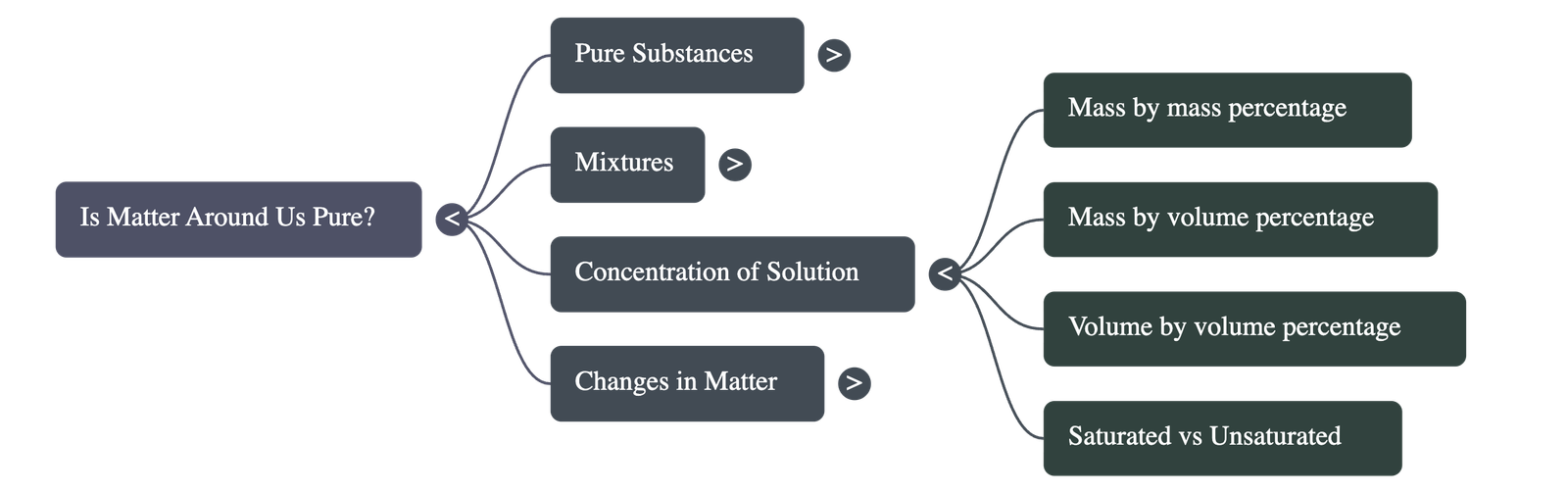 - Mixtures: Most matter around us (like sea water, minerals, soil, milk) exists as mixtures. Mixtures are constituted by more than one kind of pure form of matter (substance).