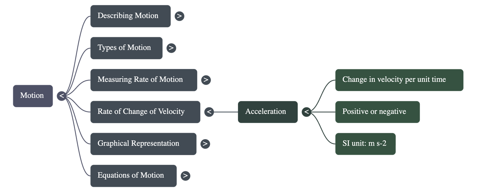 - Acceleration: A measure of the change in the velocity of an object per unit time.