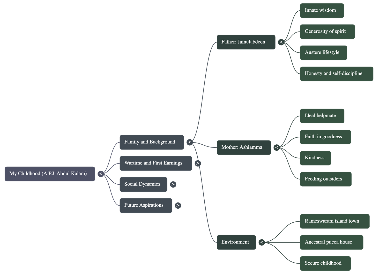 - Upbringing: His father was austere and avoided inessential luxuries but ensured all necessities like food, medicine, and clothes were provided. Kalam recalls his childhood as very secure, both materially and emotionally.