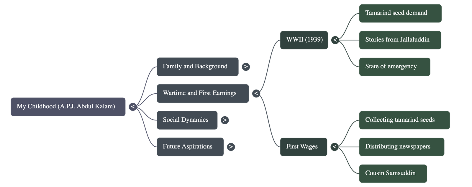 - First Earnings: When the war broke out in 1939 (Kalam was eight), there was a sudden demand for tamarind seeds. Kalam collected and sold them, earning one anna per day.