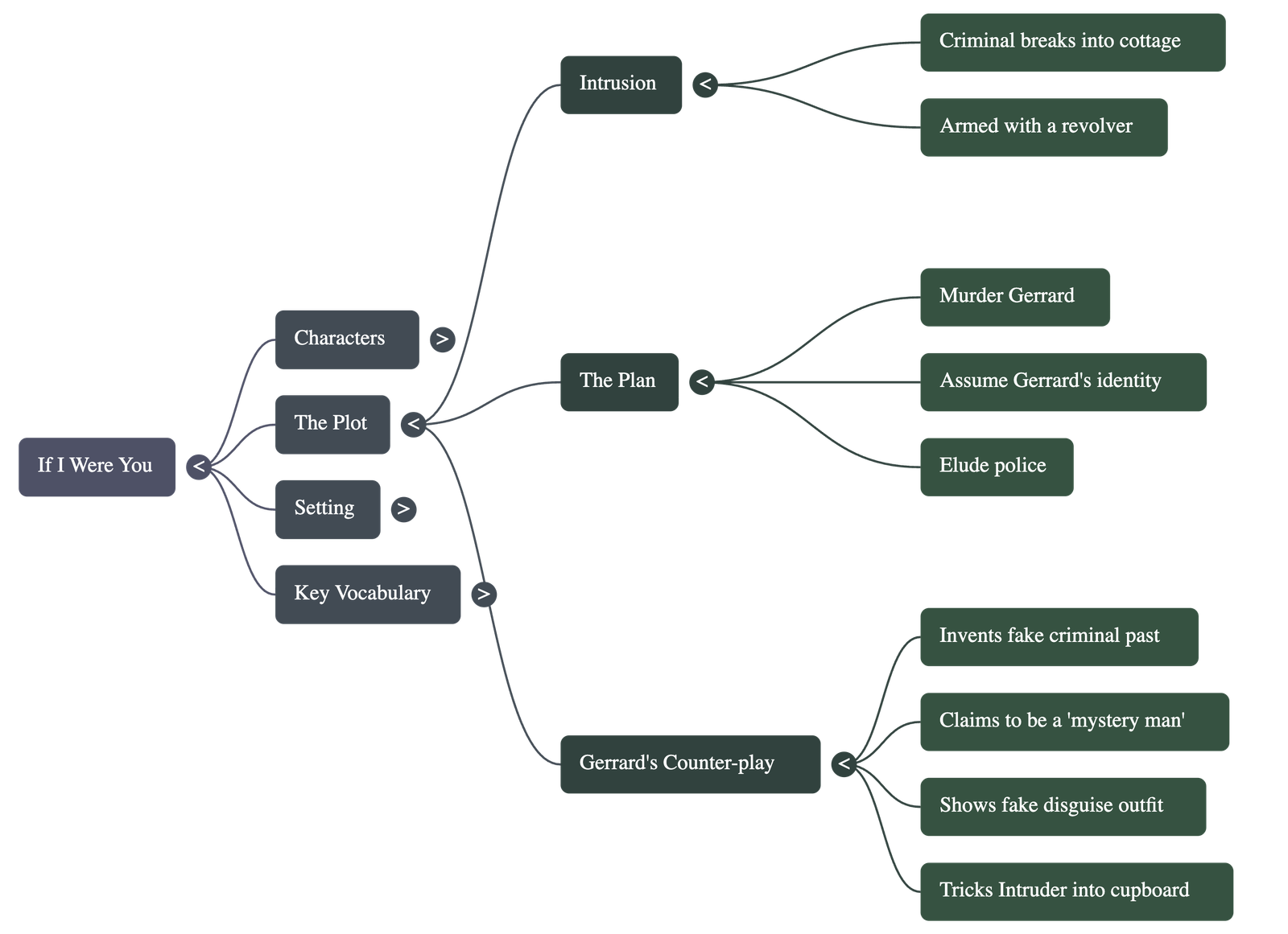 - • Identity Theft: The Intruder explains his motive: he intends to kill Gerrard and take on his identity. Since they look alike, he believes he can live as Vincent Charles Gerrard and stop running from the police.
