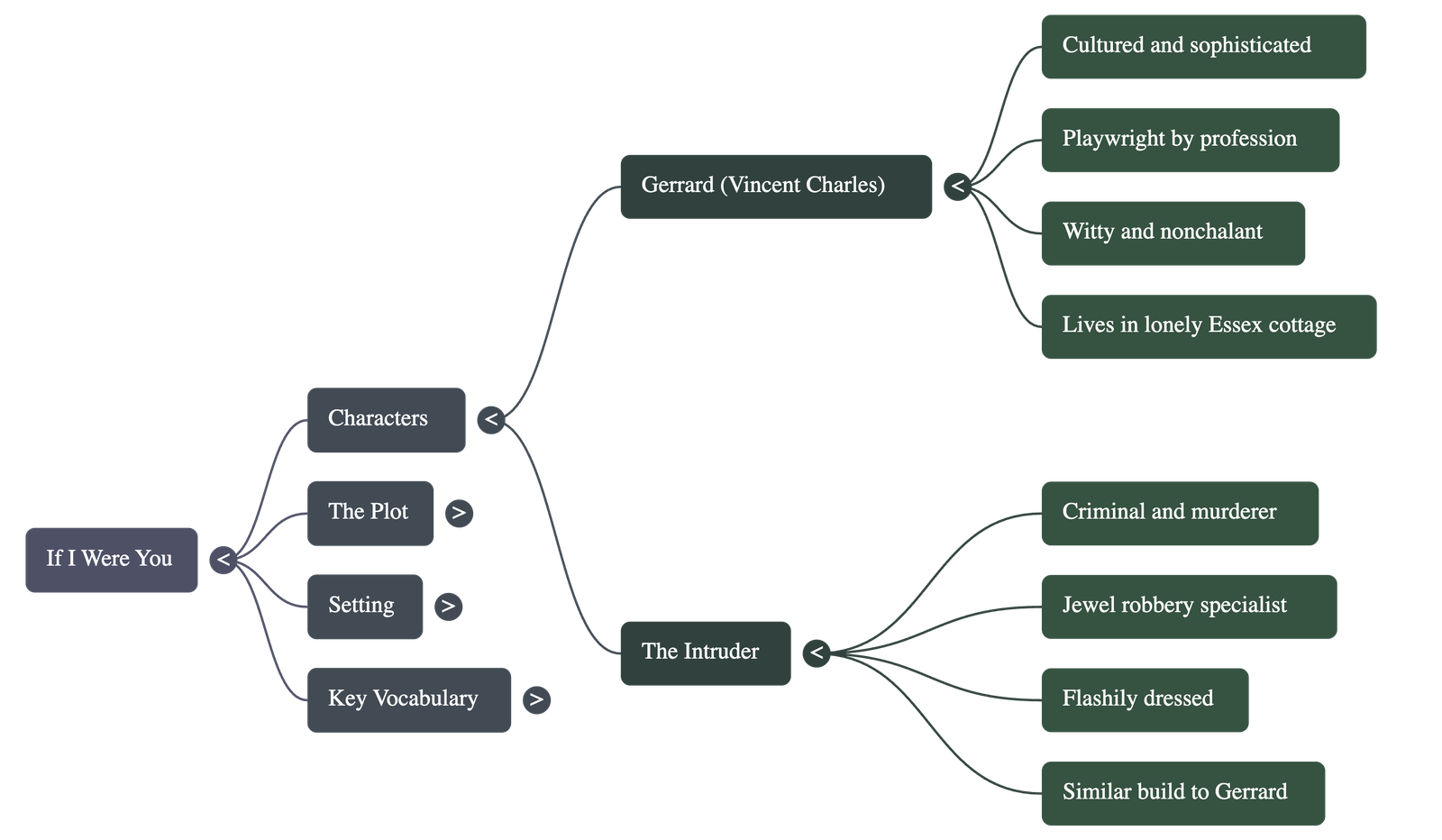 - • The Scene: The play opens in a lonely cottage in Essex. The occupant, Vincent Charles Gerrard, is a man of medium height wearing horn-rimmed glasses and a lounge suit. He speaks with a cultured voice.