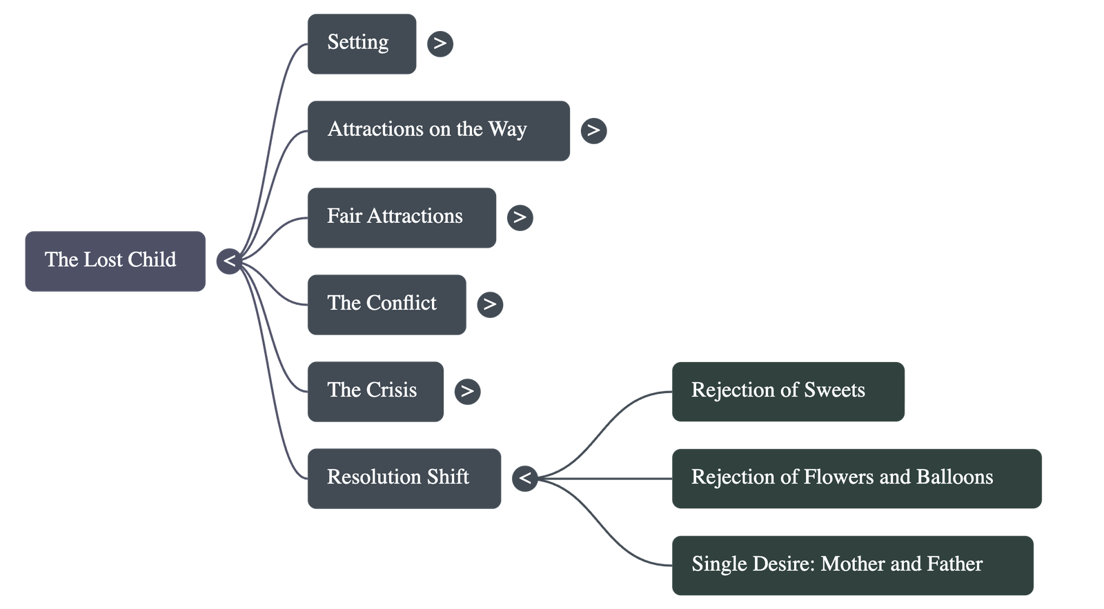 At every offer—whether it was a ride on the horse, the nice music, the rainbow balloons, the smelling flowers, or the sweets—the child turned away. He shut his ears, turned his nose, and turned his face, reiterating only one sob: "I want my mother, I want my father!" The story highlights that without his parents, the things the child earlier craved held no value for him.