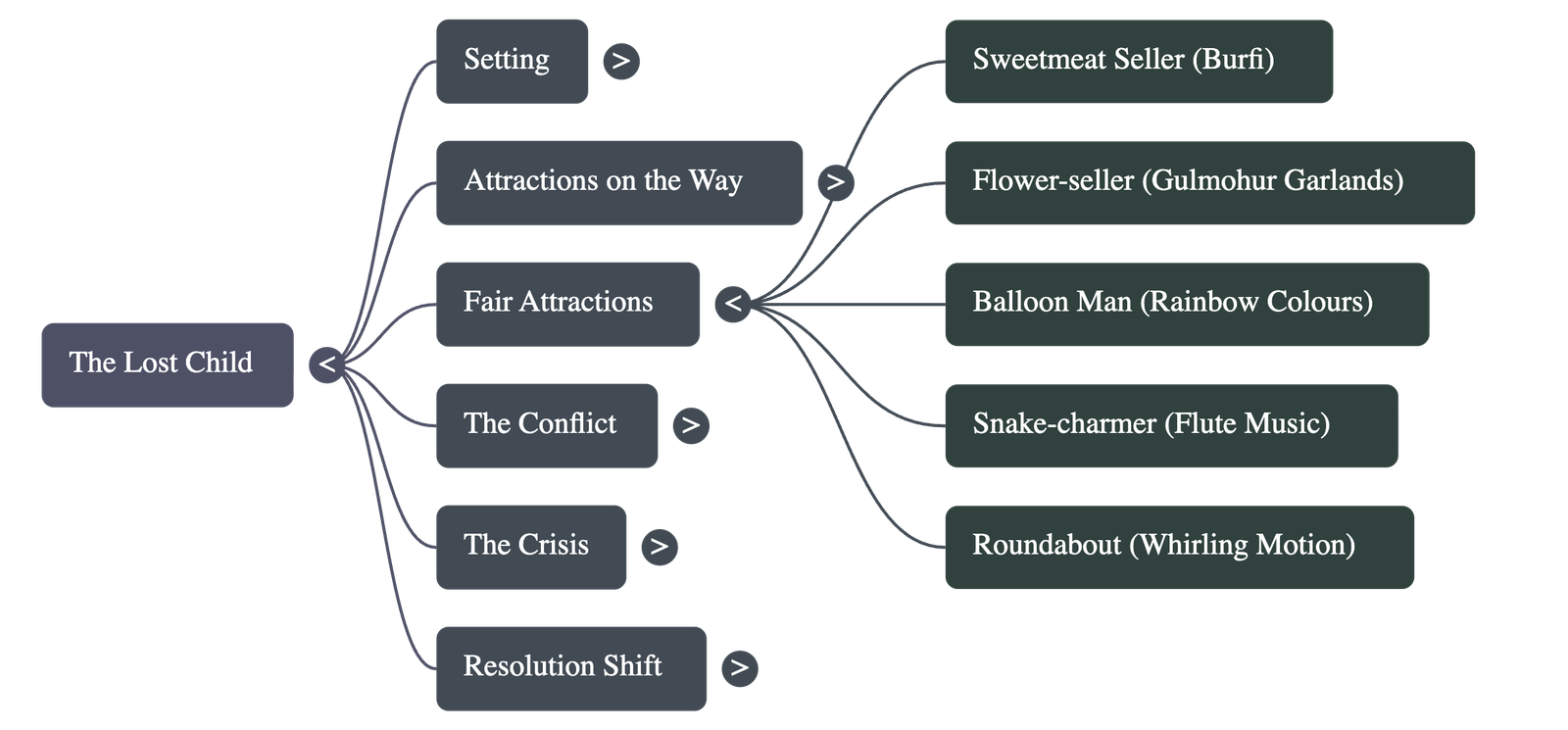 As they entered the fair, the child was repelled and fascinated by the confusion. He saw many things he desperately wanted but did not fully ask for, knowing his parents' likely excuses:- Sweets: He wanted burfi from the sweetmeat seller but knew his parents would call him greedy.