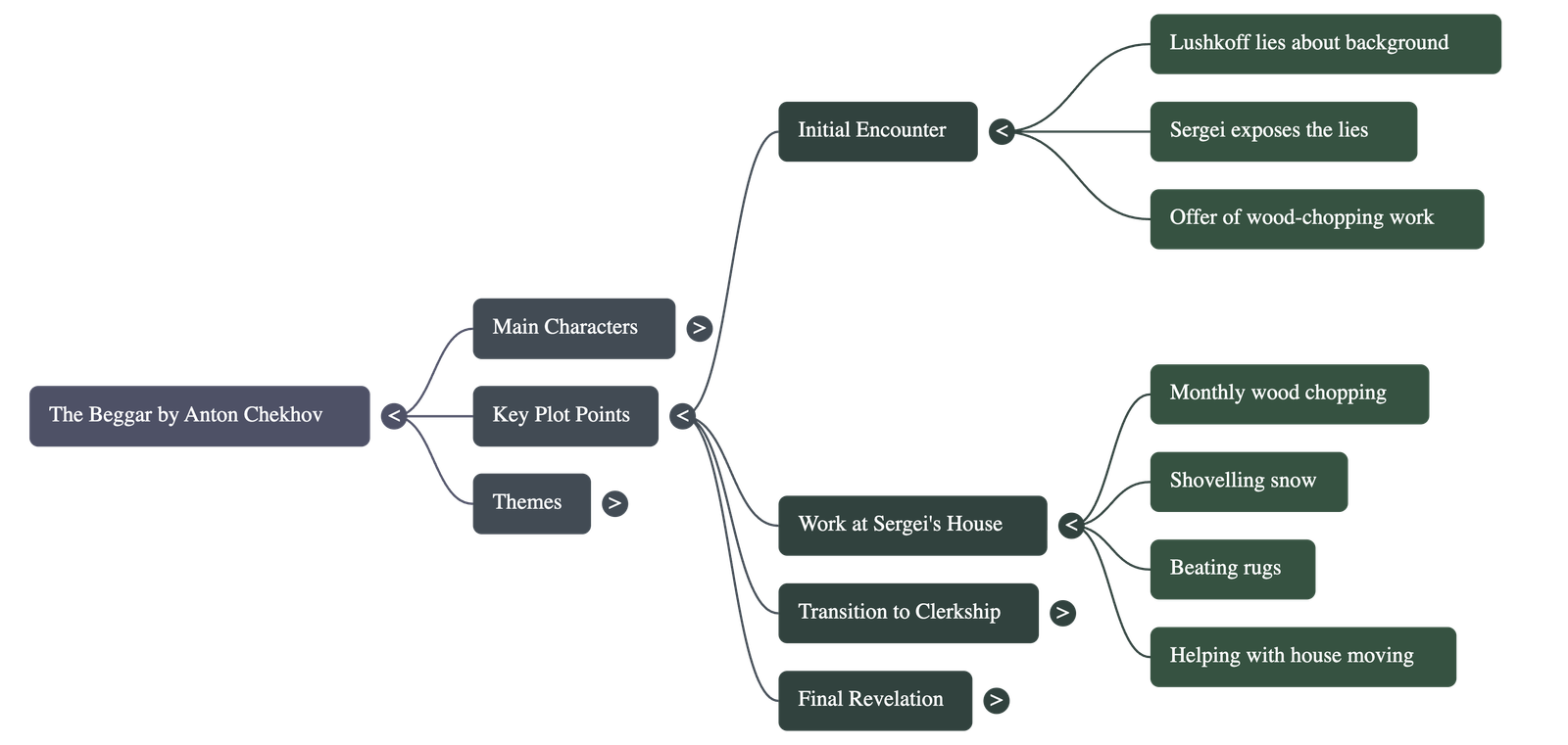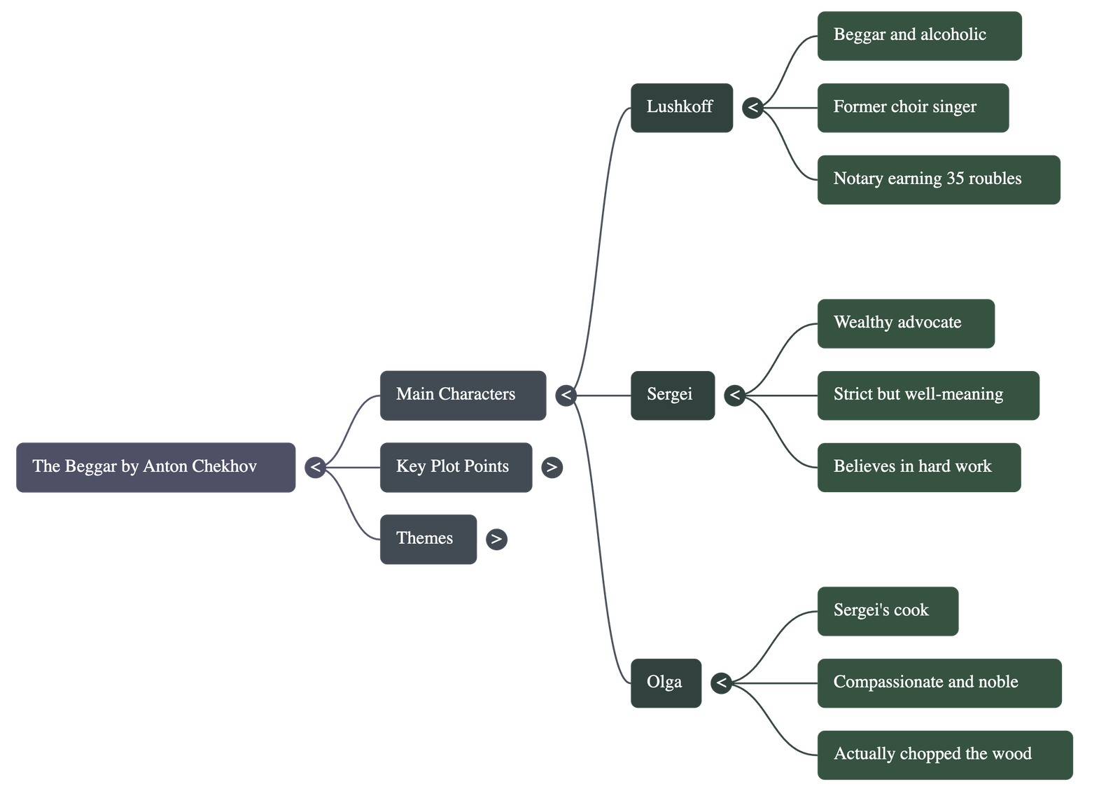 - A Challenge to Work: Sergei tells Lushkoff that he should work instead of begging. He offers him a job chopping wood.