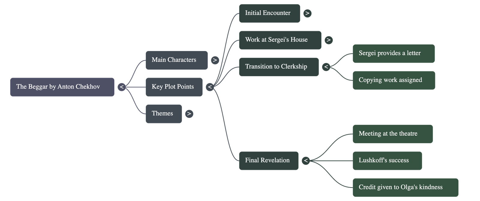- The Beggar’s Plea: A ragged man named Lushkoff approaches Sergei, an advocate, begging for money. He claims to have been a village schoolteacher for eight years who lost his position due to intrigues and lies.