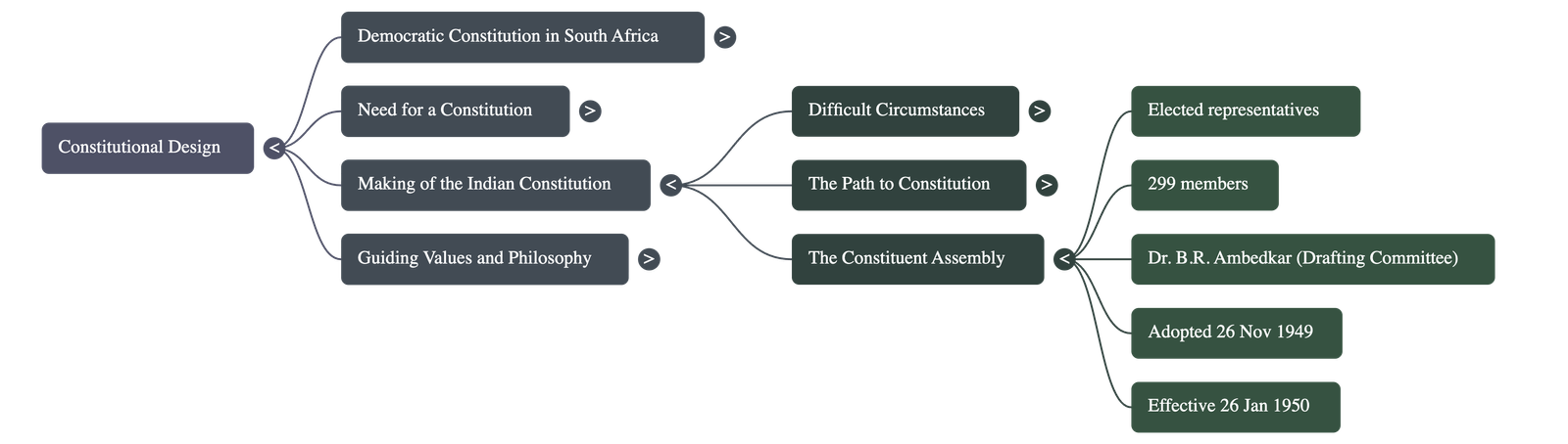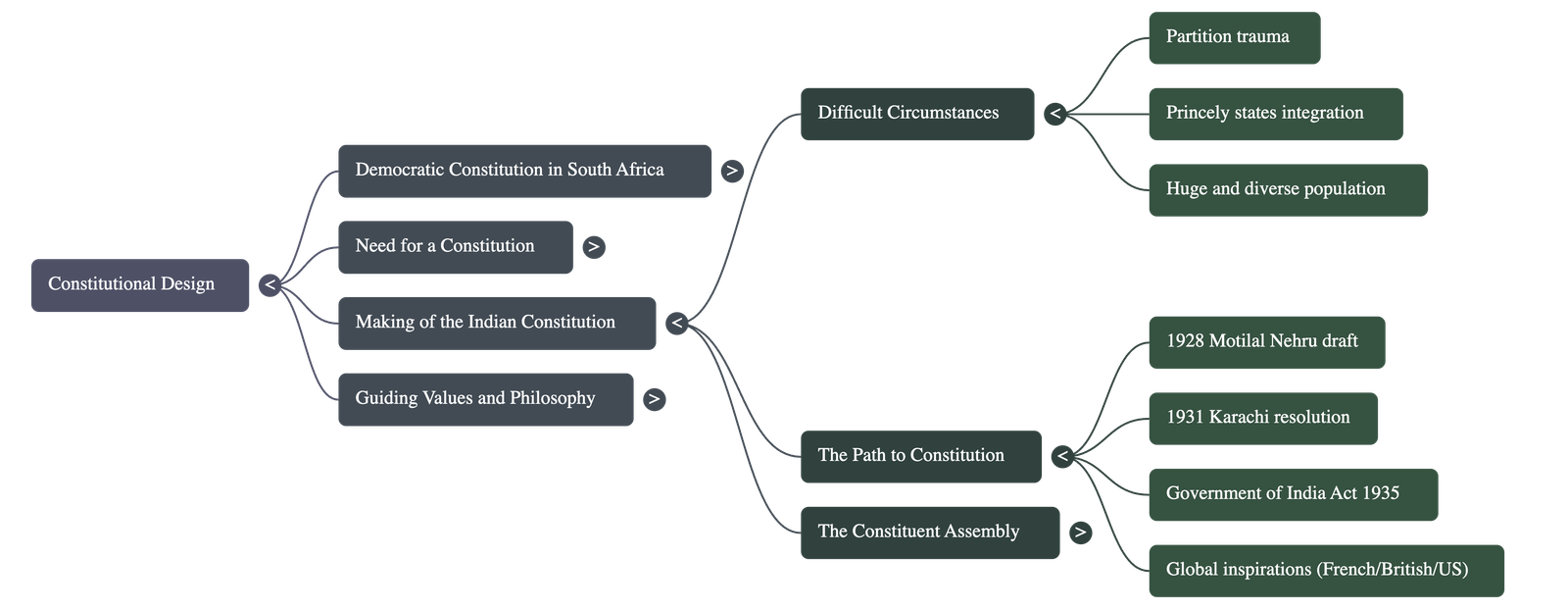 - Prior Consensus: Unlike South Africa, Indian leaders had already agreed on basic values during the freedom struggle. Motilal Nehru (1928) and the Karachi session of the Congress (1931) had drafted constitutional documents committing to universal adult franchise, freedom, equality, and minority rights.