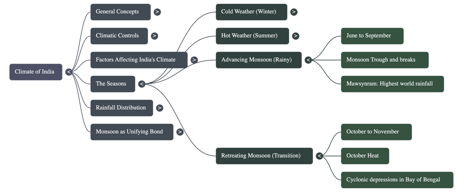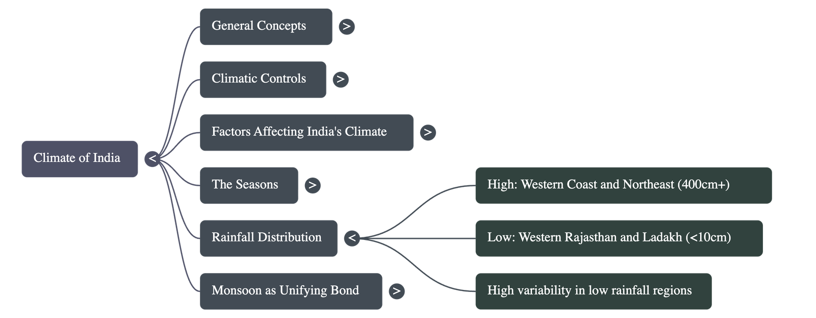 - Diurnal Range: The Thar Desert sees huge day-night variations (50°C to 15°C), whereas Andaman and Nicobar islands have almost no difference.